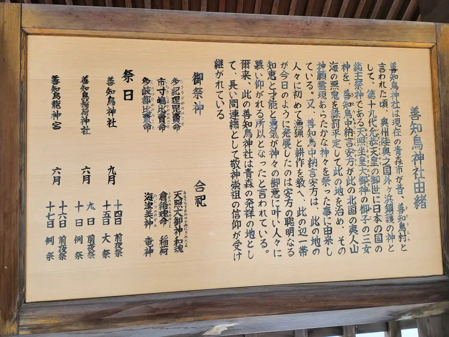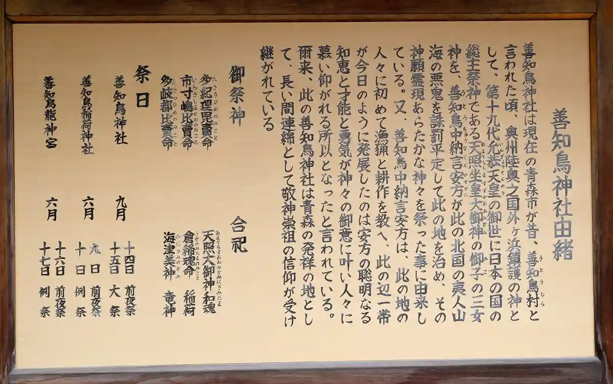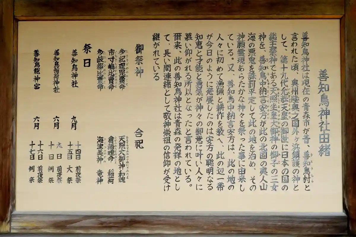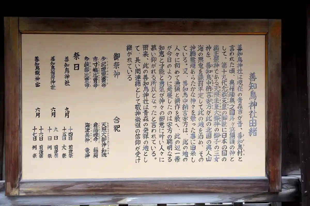 現在の青森市が善知鳥村と呼ばれていた頃、この地を治めていた善知鳥中納言安方が、日本の国の総主祭神で…