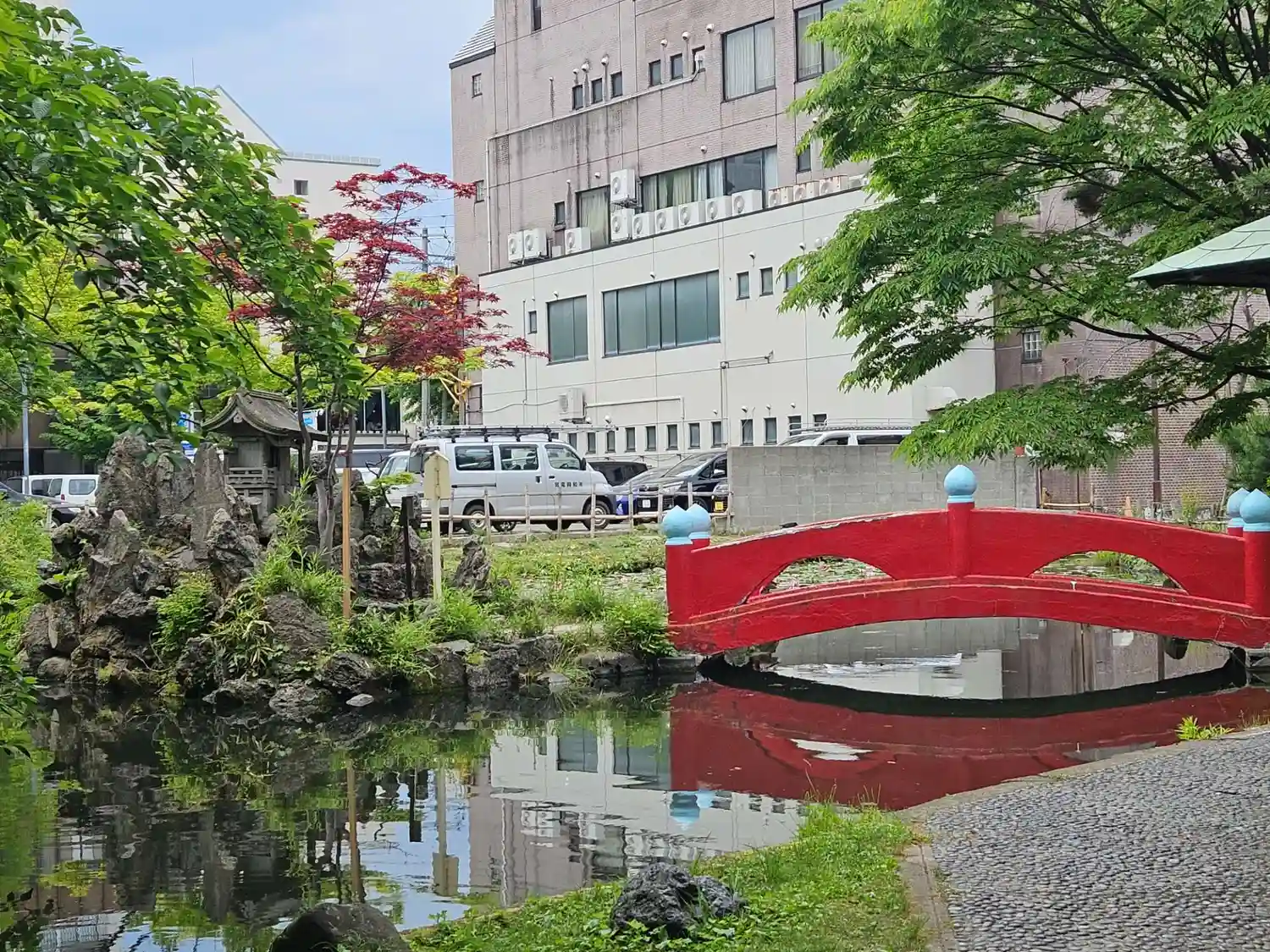 本殿の背後にある池。島がポツンと浮いていて、赤い橋が架かっている。
