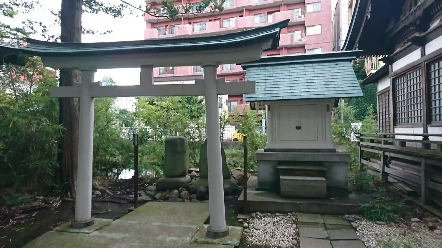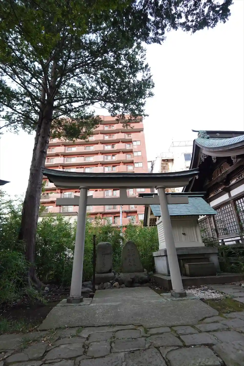 社殿左奥には鳥居が立っている。