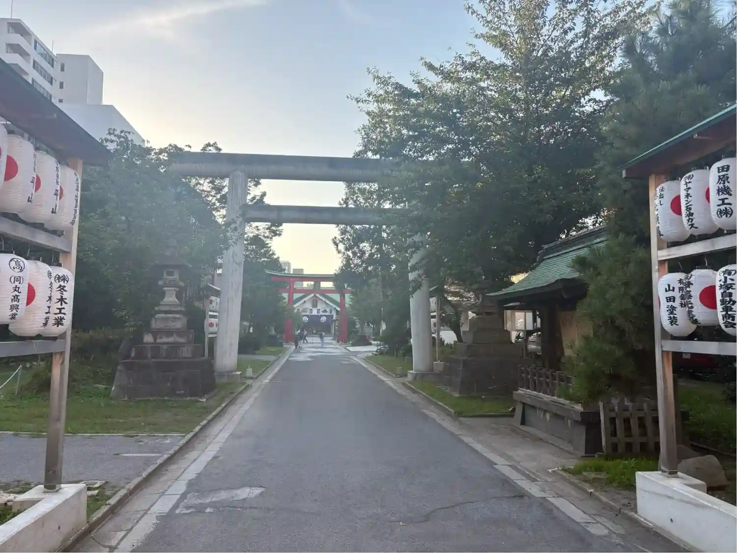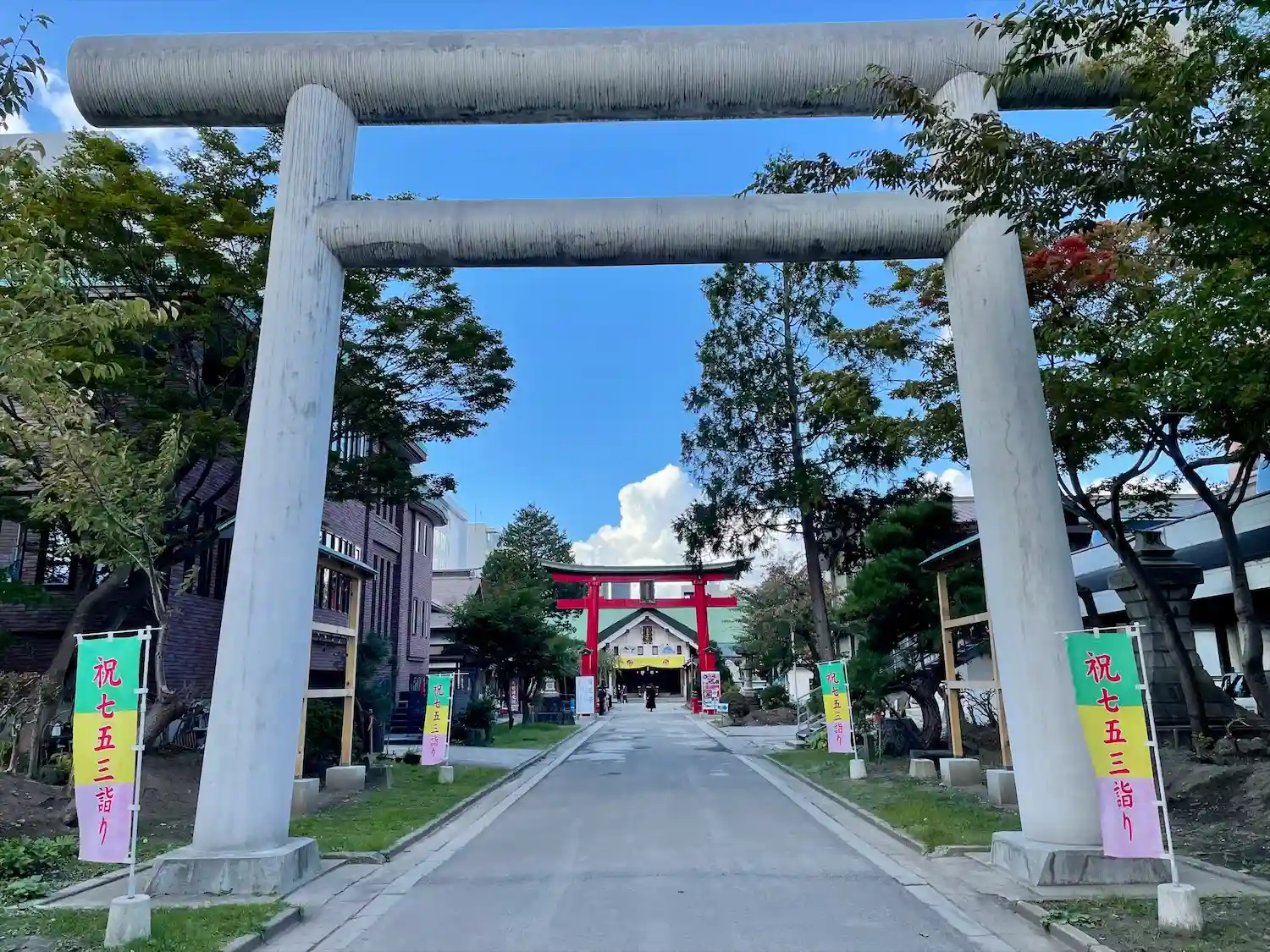 一の鳥居は大きくて白くて、…