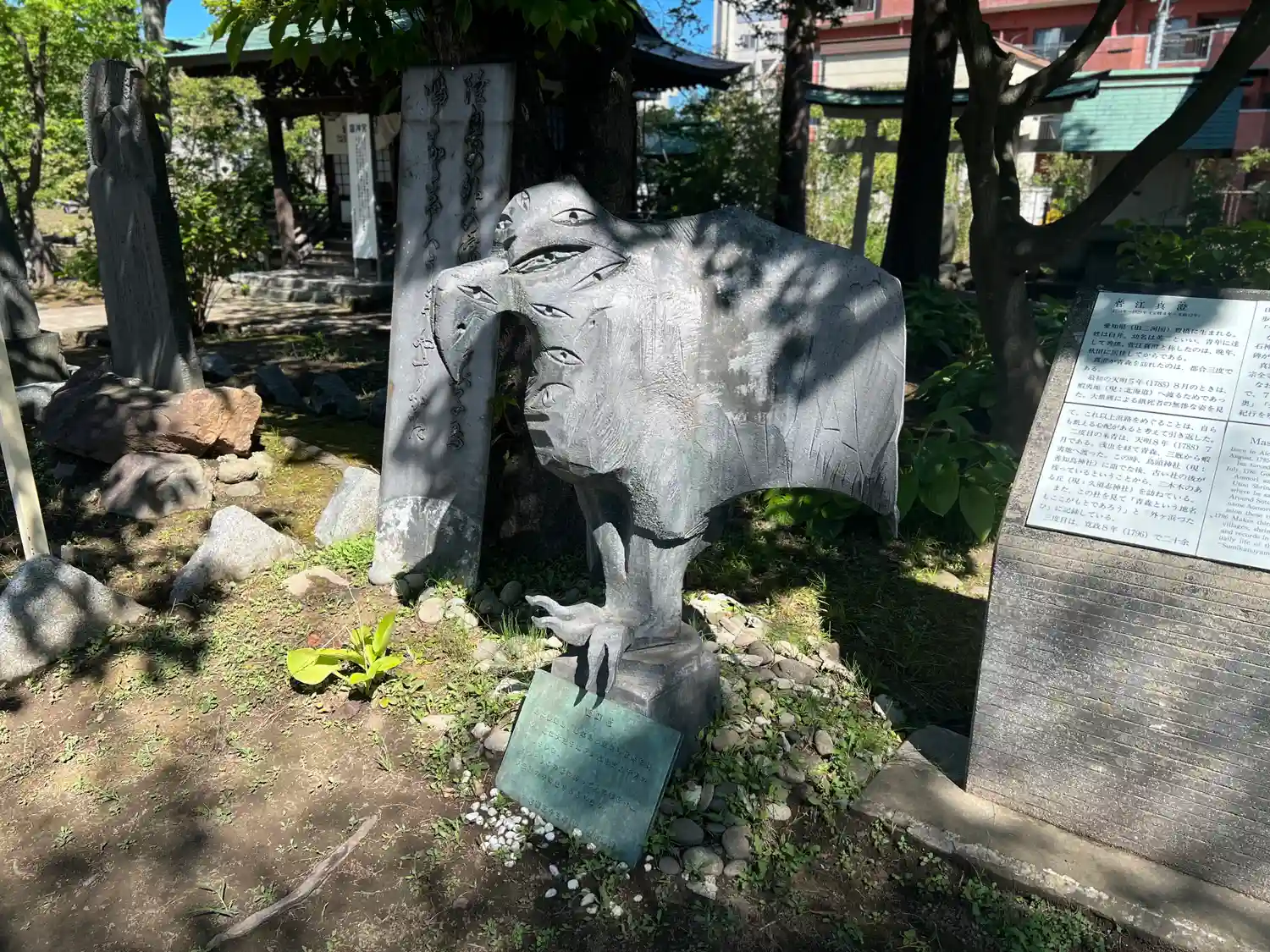 拝殿に向かって右手の<うとう沼>近くに、いつ区化の境内社とたくさんの石碑が立っている。