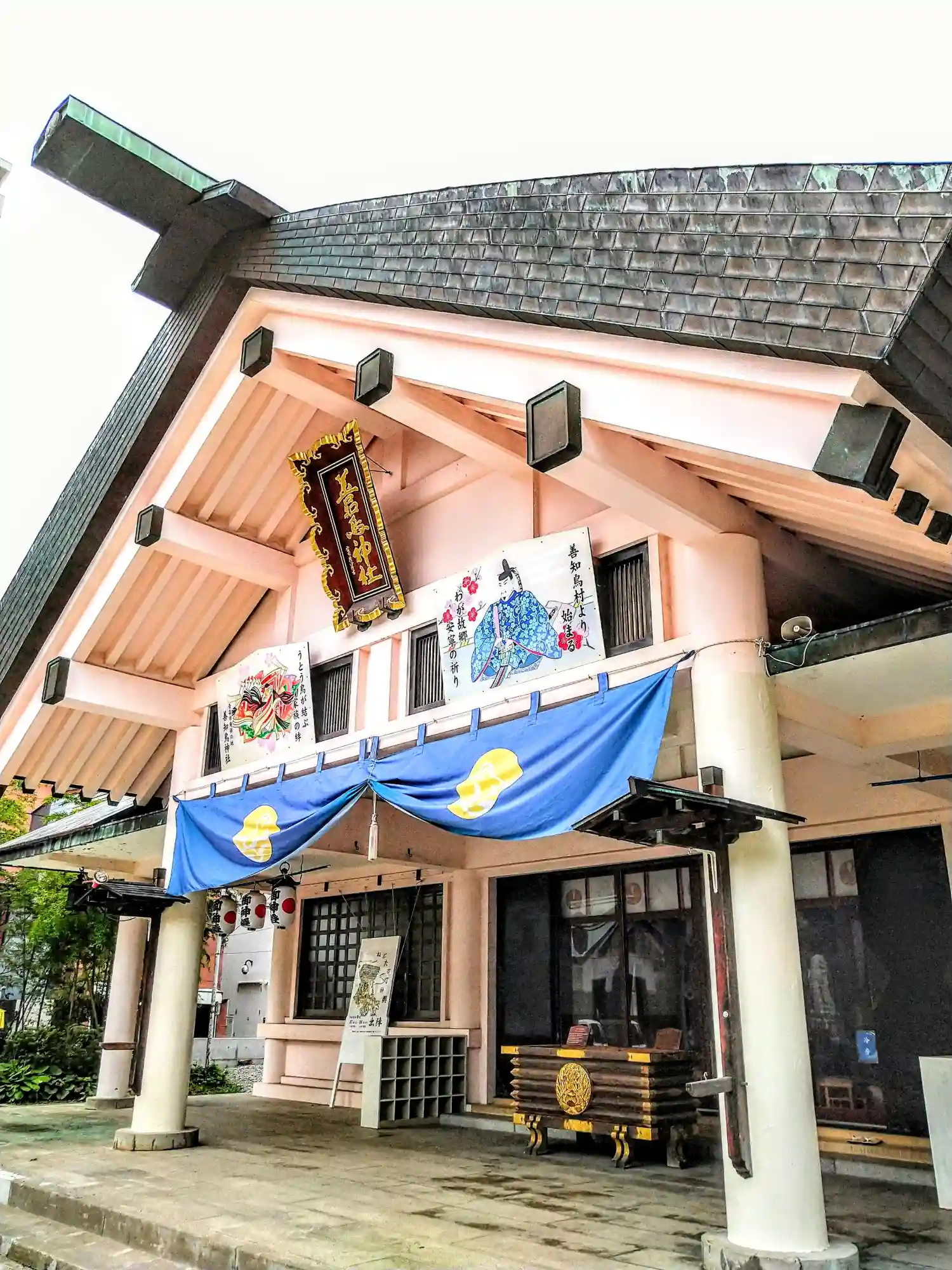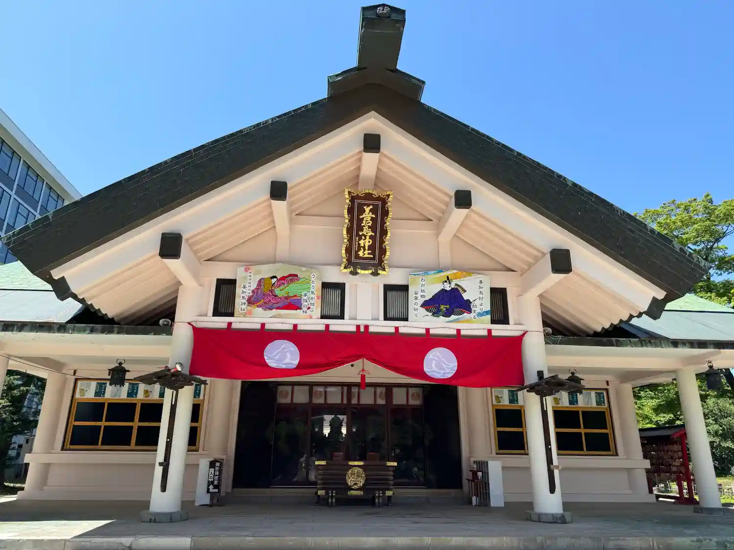 <拝殿>正面。鉄筋コンクリ製(たぶん)の神明造。北海道の神社みたい。似ているのは、ともに雪深いからかな。