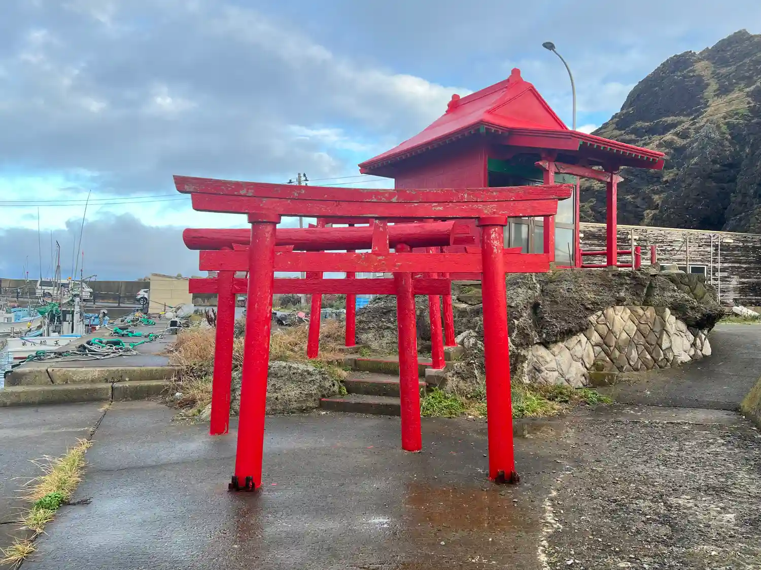 津軽半島帯島の最北端にある神社ですが、鳥居等建物は手入れが行き届いており、しっかりペンキが塗られて…