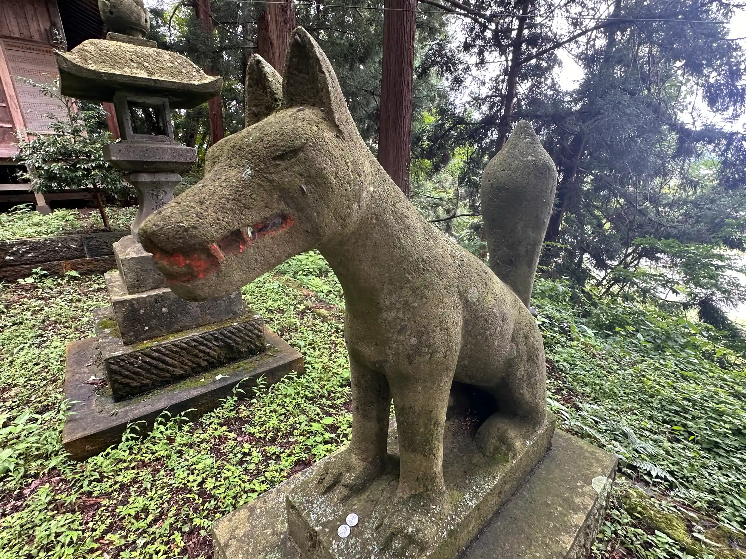 「大狼神社」扁額も変わっていたので熊に注意して本殿へ 狼の狛犬発見!と思いきや狐のようでした 御祭神は倉稲魂命 稲荷神社の分神。だから狛犬が狐みたいです、狼だはなく少し残念でした