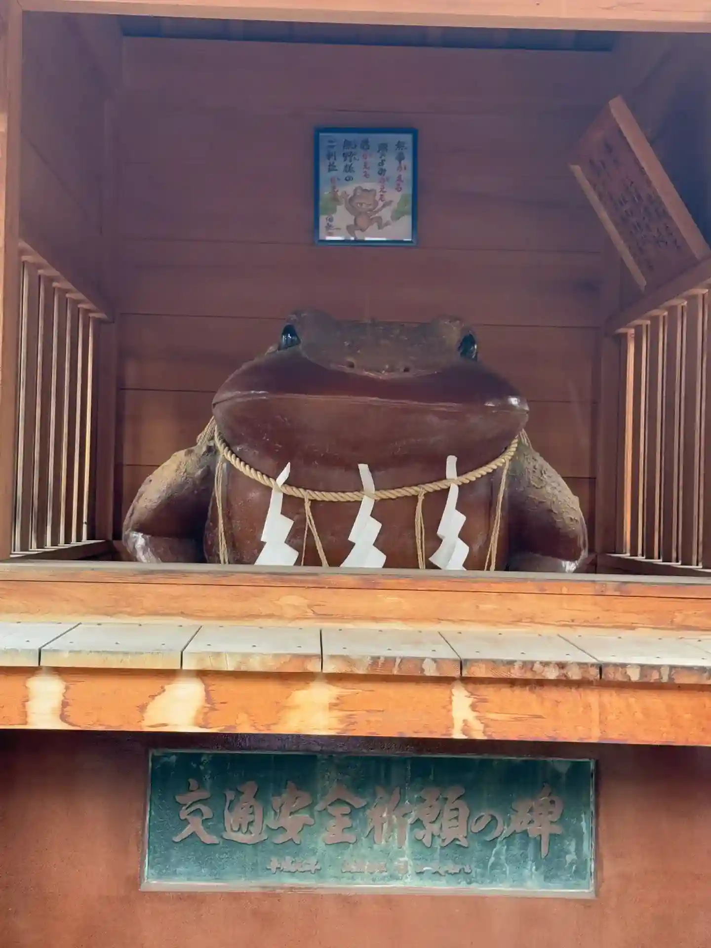 このかえるの像は交通安全と金運の霊力を持つと言われ、高さ約63糎(cm)、幅93糎(cm)、長さ130糎(cm)、信楽焼で日本一の大きさを誇るものです。当神社創建1201年、平成元年、弘前市市制100周年の意義ある年に交通安全を末長く願う有志が熊野奥照神社の御加護と、かえるの像の縁起にあやかってここに建立したものである。