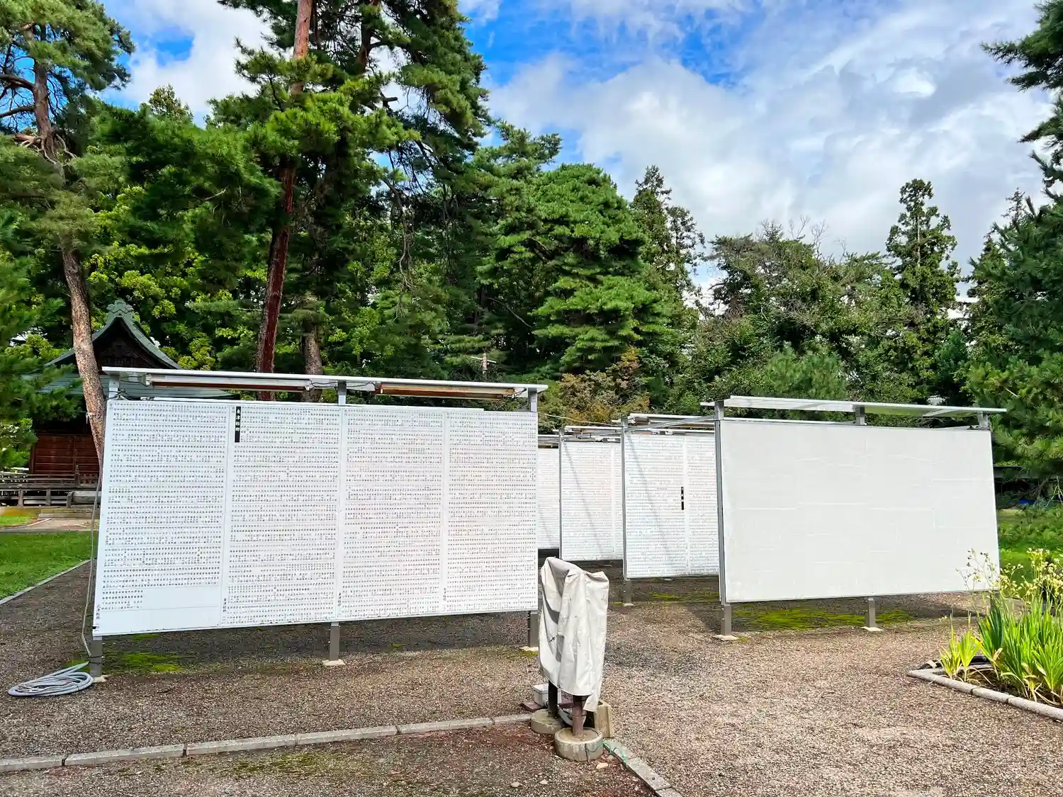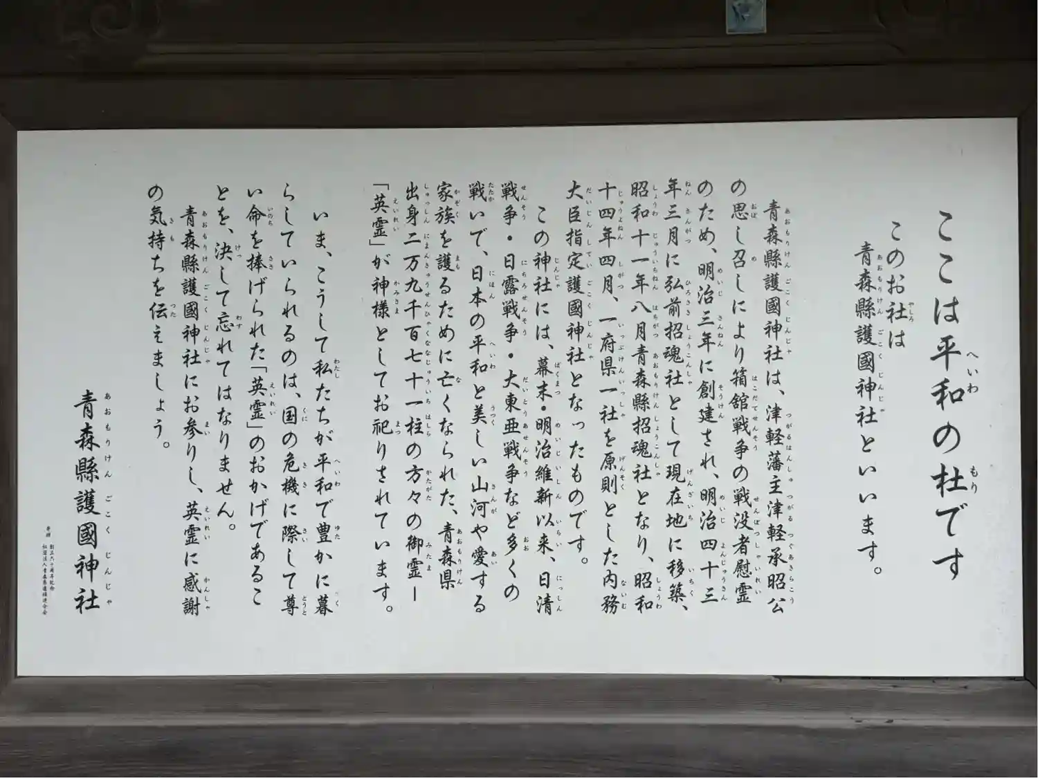 境内の北東部にある<祭神銘板>。青森県内の出身地別に英霊29,184柱の氏名が記されている。