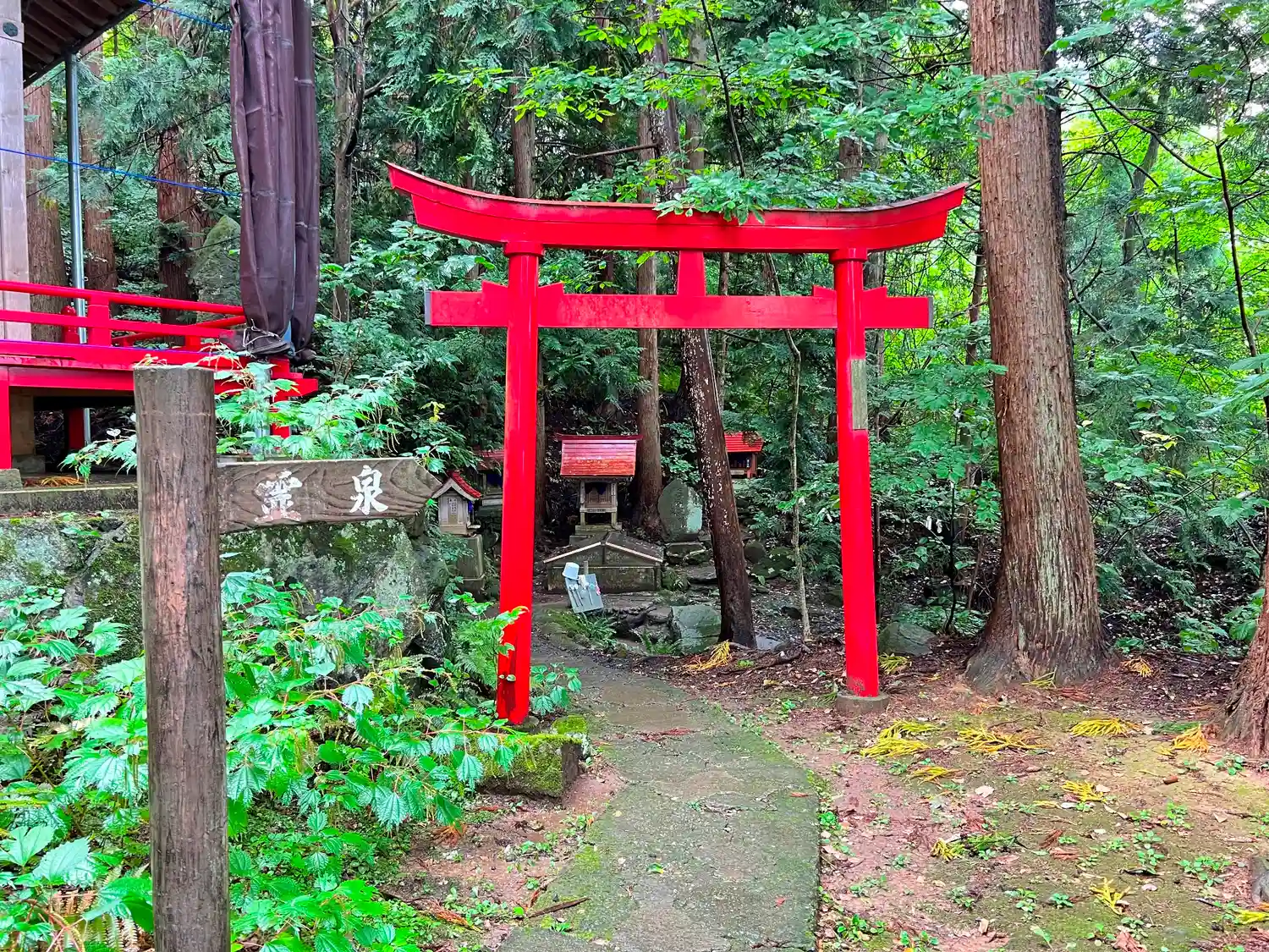 社殿の右側に、境内社と霊泉に向かう入口があり、鳥居が立っている。