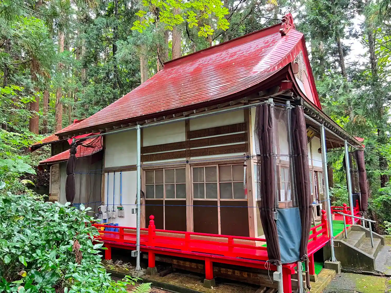 <拝殿>全景。朱色の鮮やかな塗装が印象的。