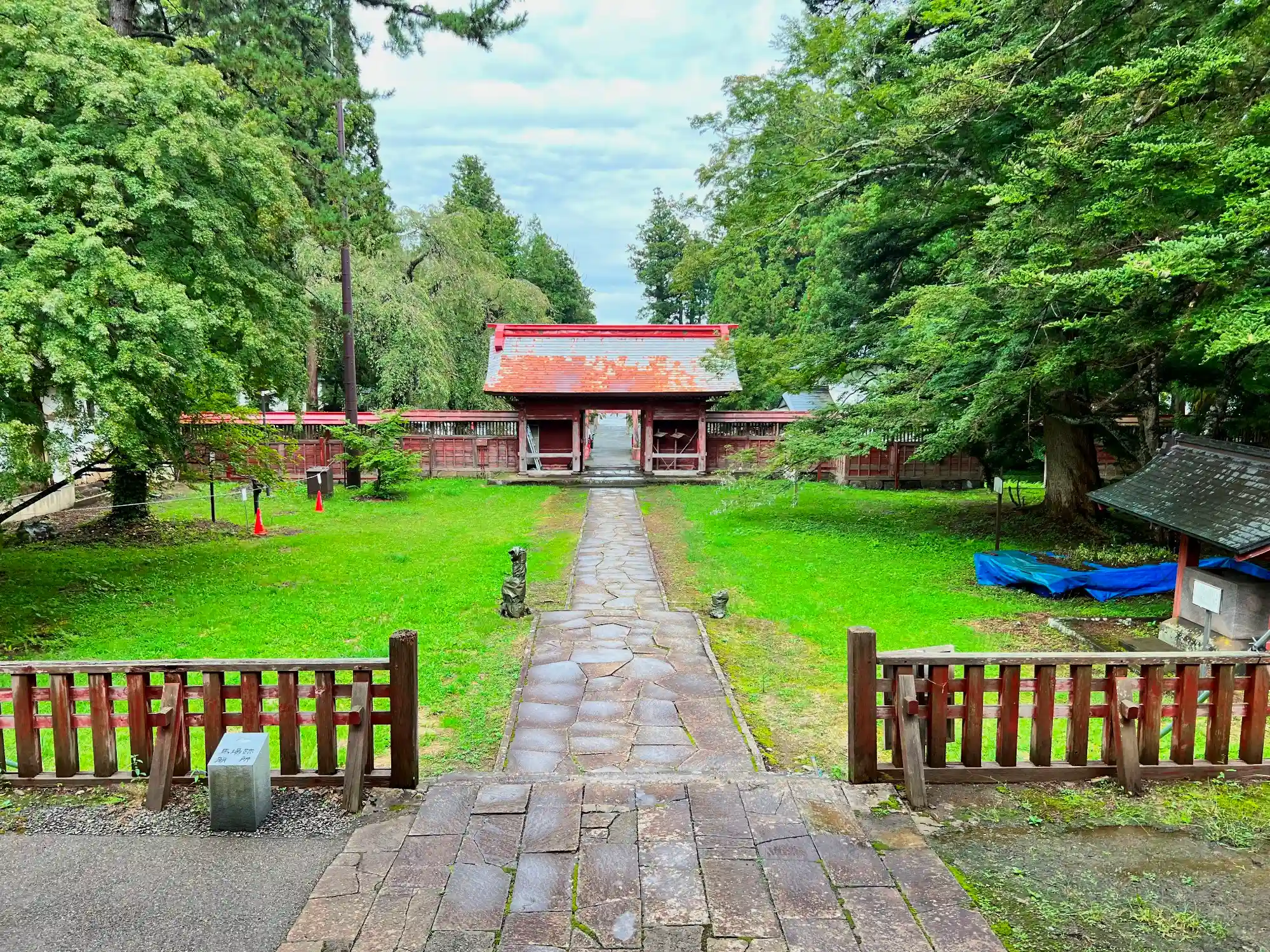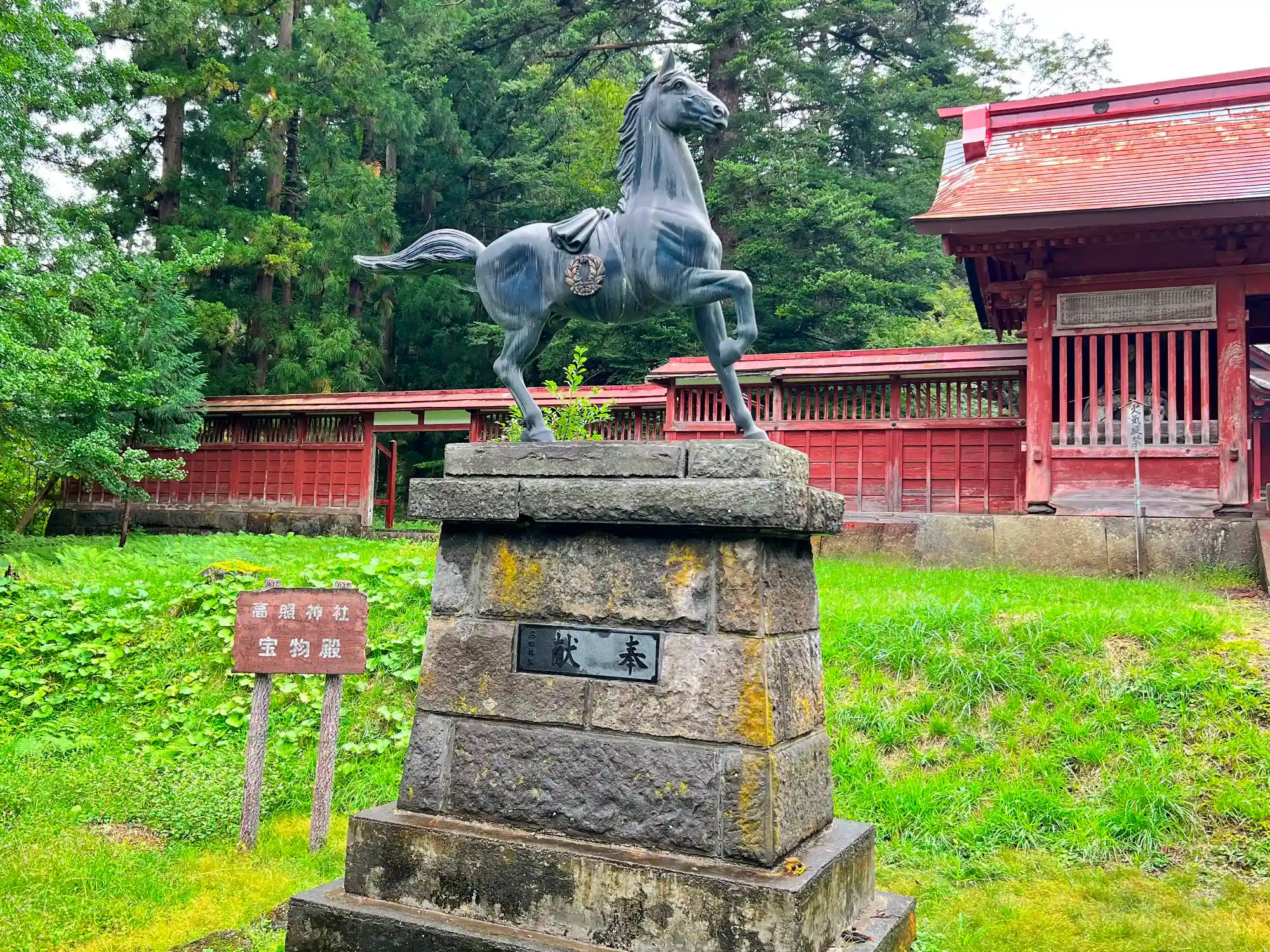 当社は、JR奥羽本線・弘前駅の西北西12kmの緩やかな丘が続く山あいにある。境内は広く森に囲まれていて、境内東端入口は県道30号線に面している。南側の敷地には「高岡の森 弘前藩歴史館」がある。深い木々の神聖な空気の漂う参道を進むと、歴史の風格を感じさせてくれる、国重文の大きな社殿に辿り着く。なお、社殿の背後(西側)少し離れたところに津軽信政公廟所があり、こちらも国重文だが、自分の雑な下調べにより見逃してしまった。かなりショック…(^_^;)