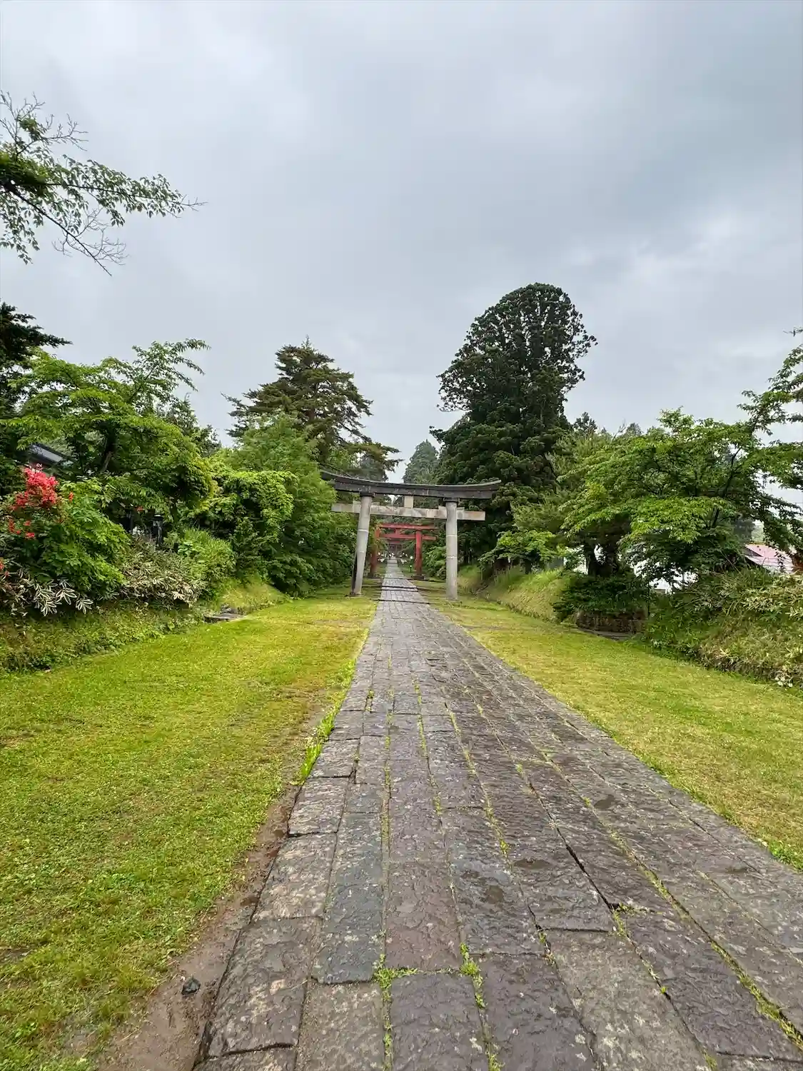 両サイドに樹木があって長い参道で雨!