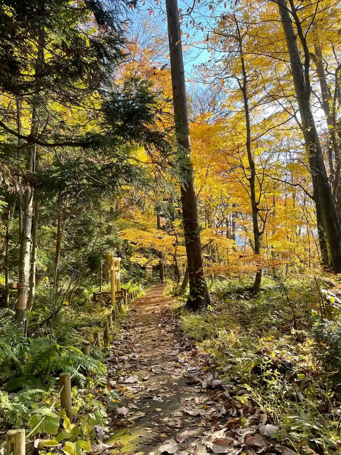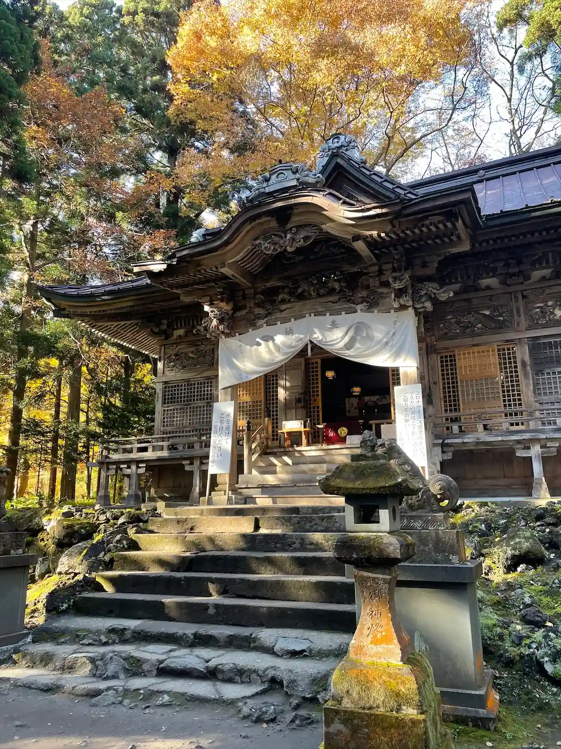 紅葉の十和田神社。夜はライトアップも。