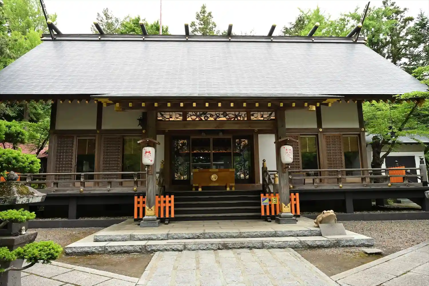 拝殿正面&柱に掛けている『みこちゃん&キャサリンの提灯』です。