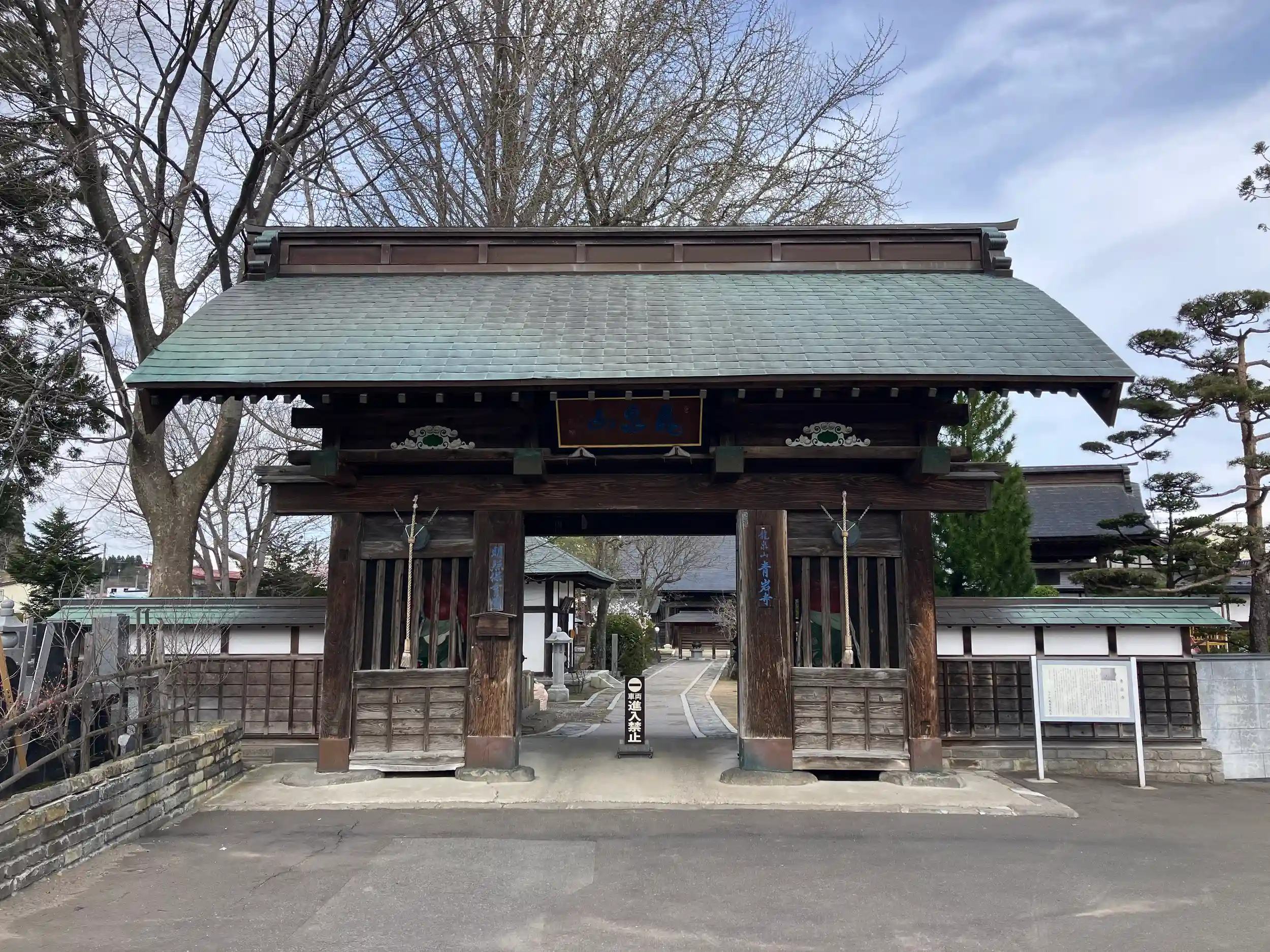 現在の本堂は1855年の再建、山門は七戸城本丸の城門を1873年に移築したものである。