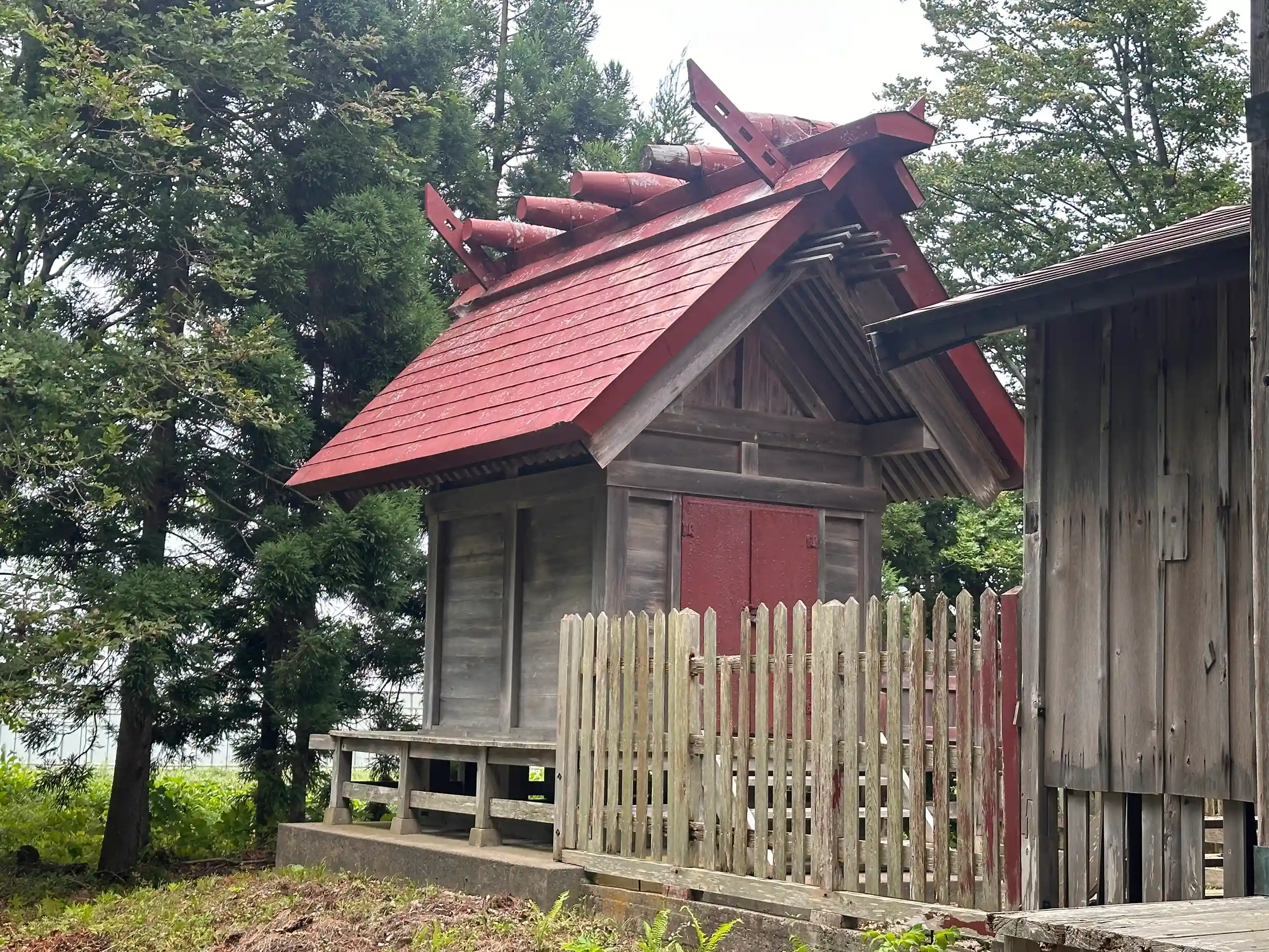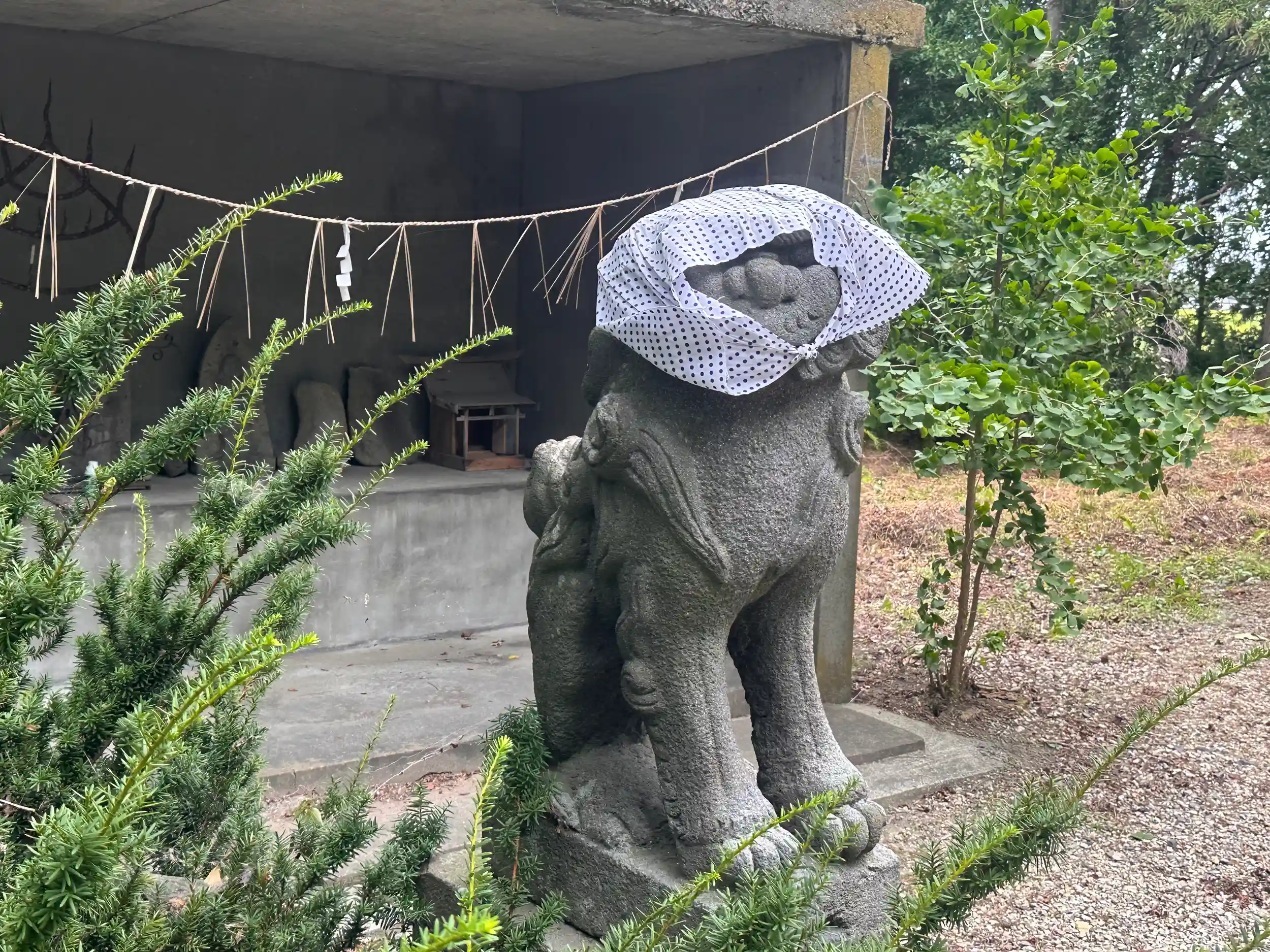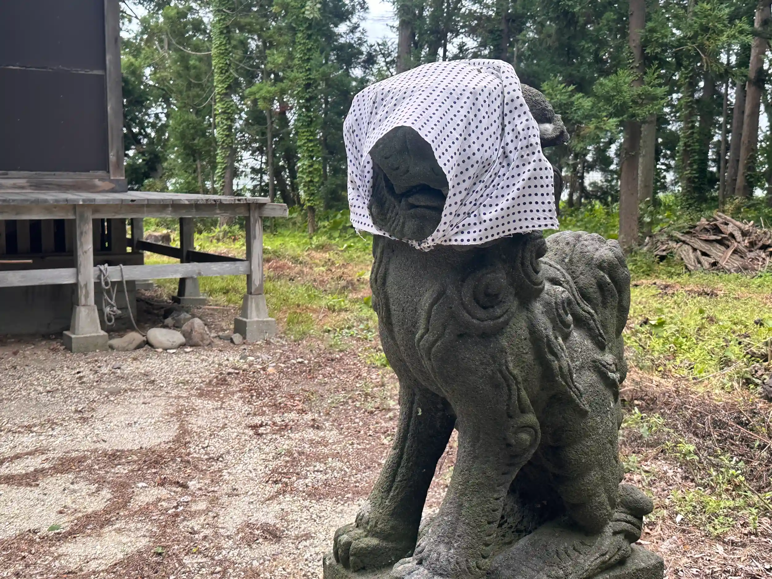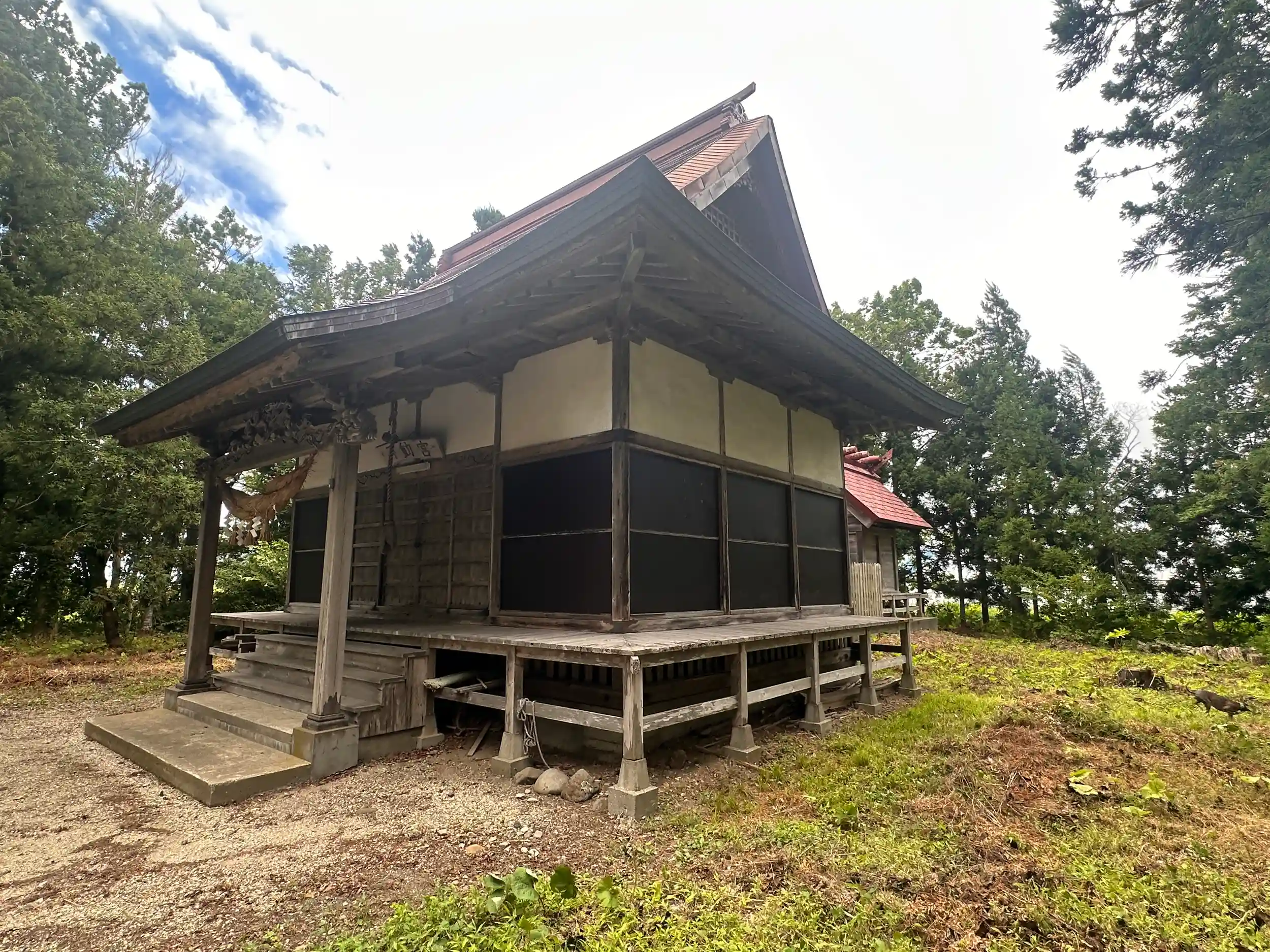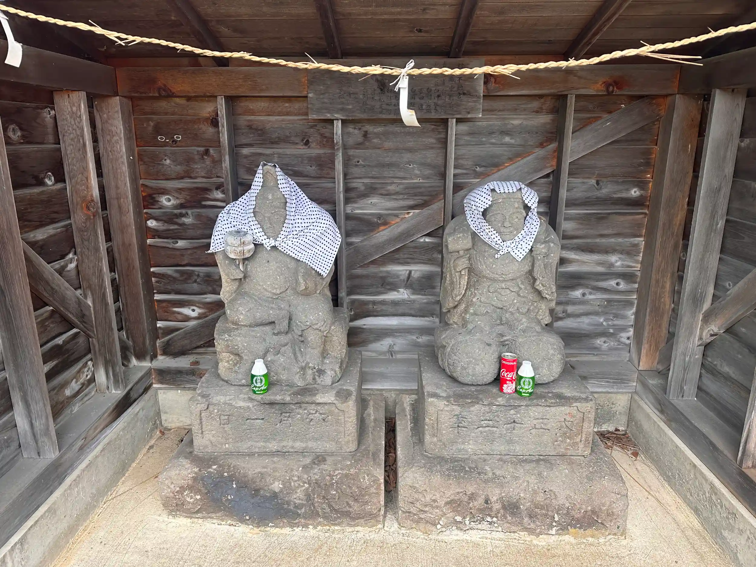 コメ米ロードを走っていると見つけました、鳥居があり神社のように見えましたが不動明王をお祀りしているようですが、本殿は切妻造、妻入り、千木は外削ぎで鰹木は5本と神社です、馬頭観世音らしきものや、女神型水虎様、ほっかむりをした大黒天と恵比寿天、何故かここまでの神社の狛犬も何件かほっかむりをしていました、寒いからなのか、この地方独特の鳥居の扁額の裏側には「鬼コ(おにこ)」と呼ばれるものがあるそうです、ここの神社の鳥居にもそのあとが残っていましたが鬼コは見当たりませんでした、ぜひ見て見たかったです