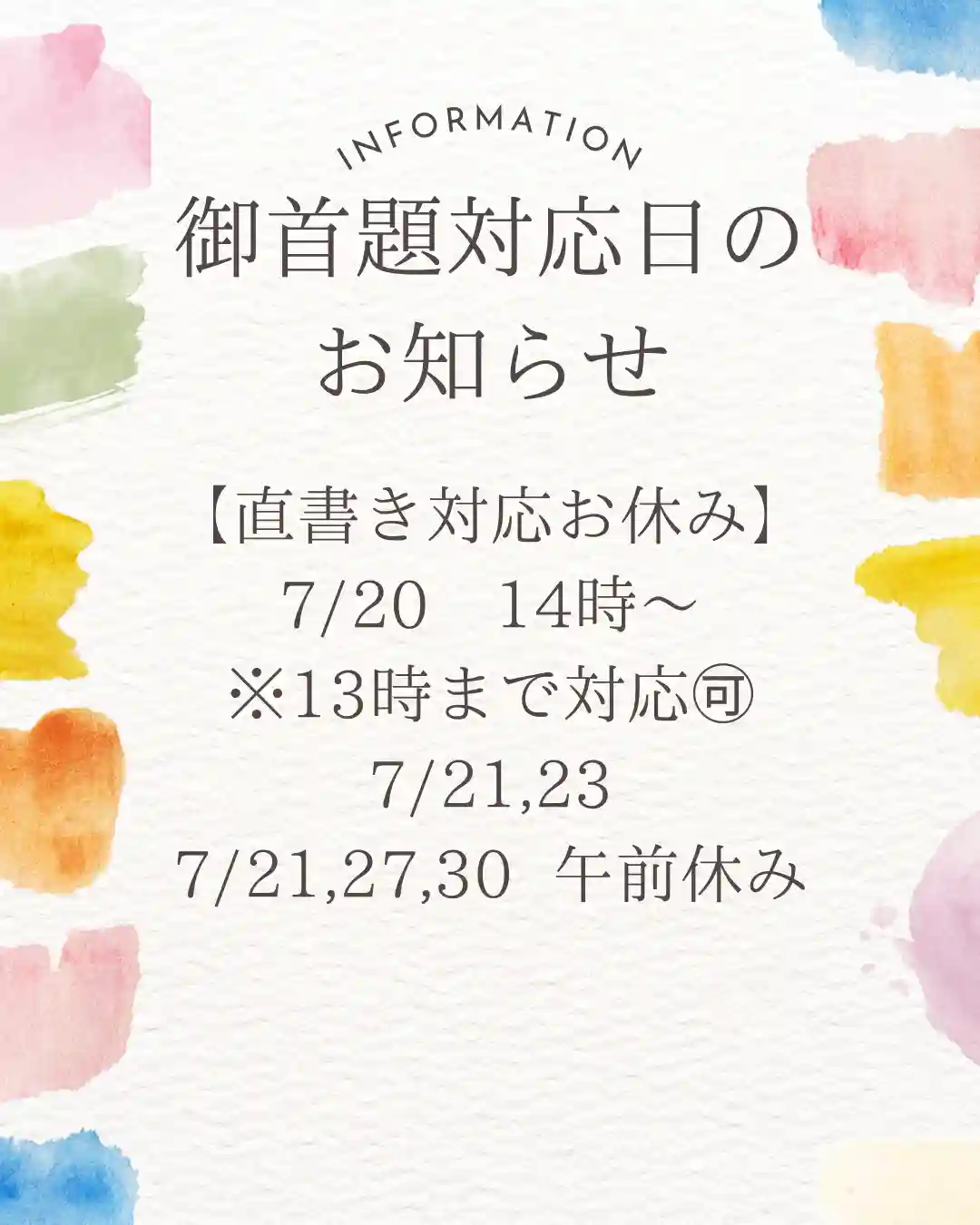 また、対応日についてお知らせしてなかったので、直書き希望の方は投稿画像に記載してある日程をもとに参拝ください。