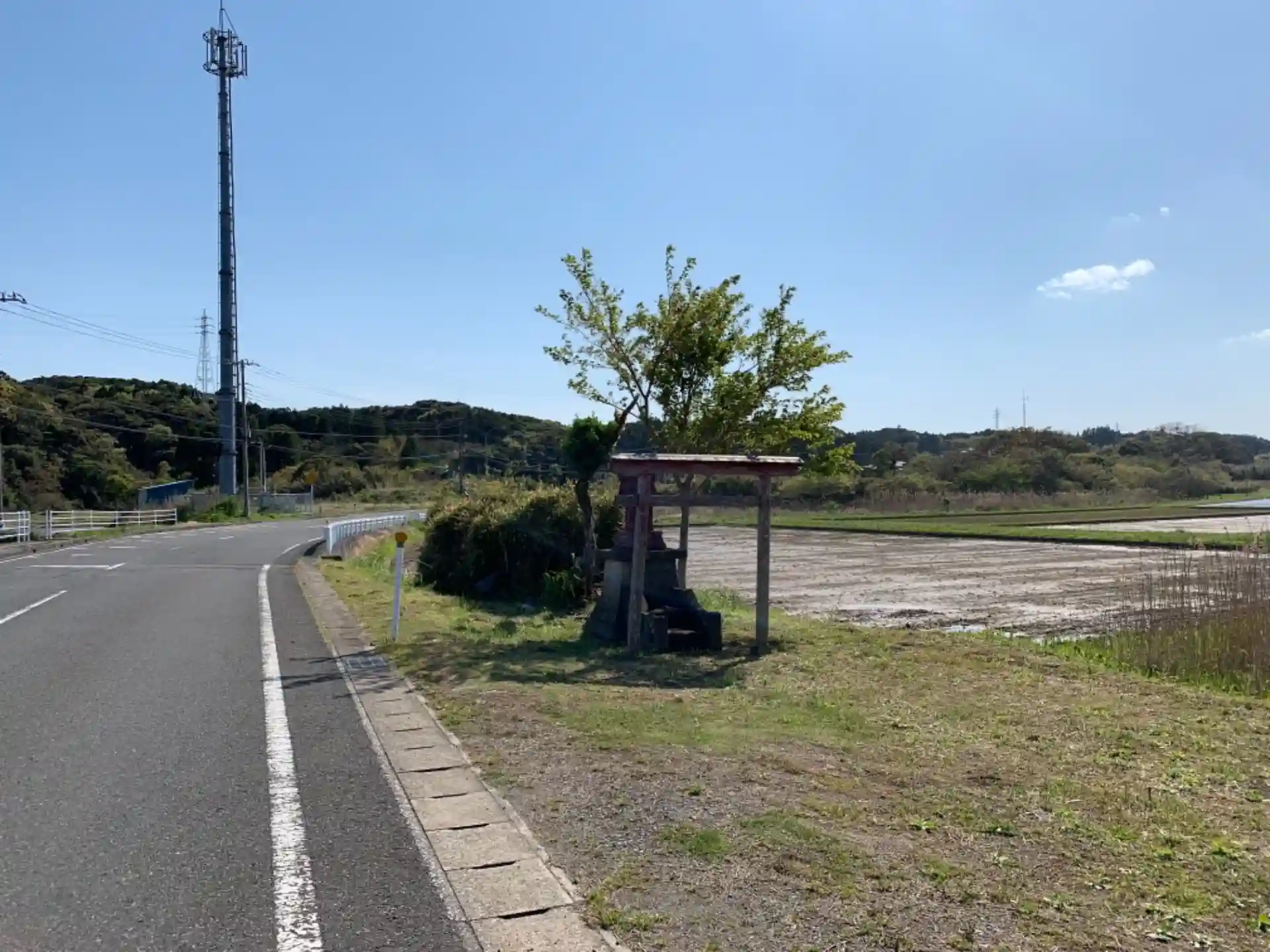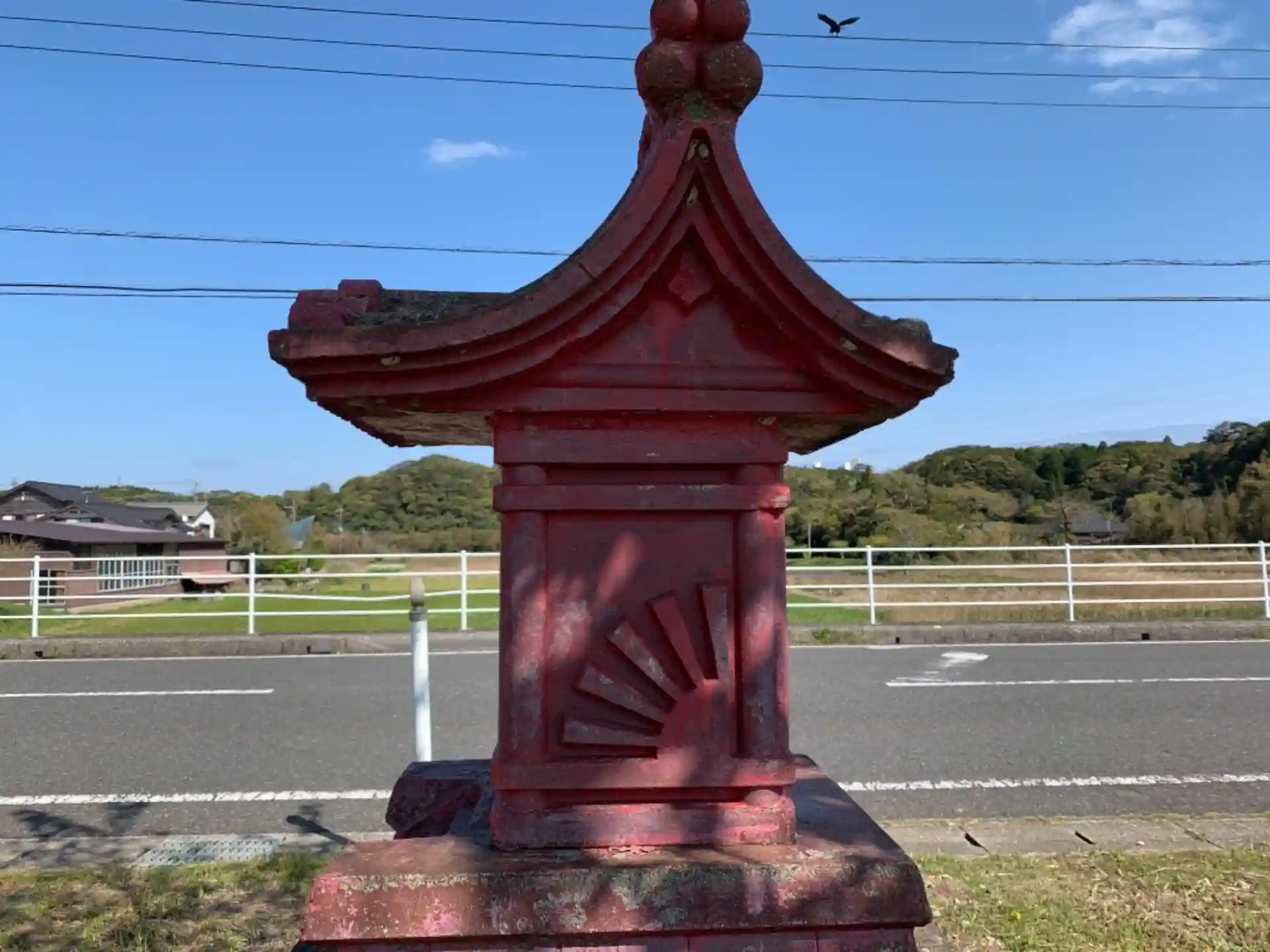 道端の小さな祠。祠の左右に日と月を象った意匠が彫られていたので、たぶん日月神社だと思います。