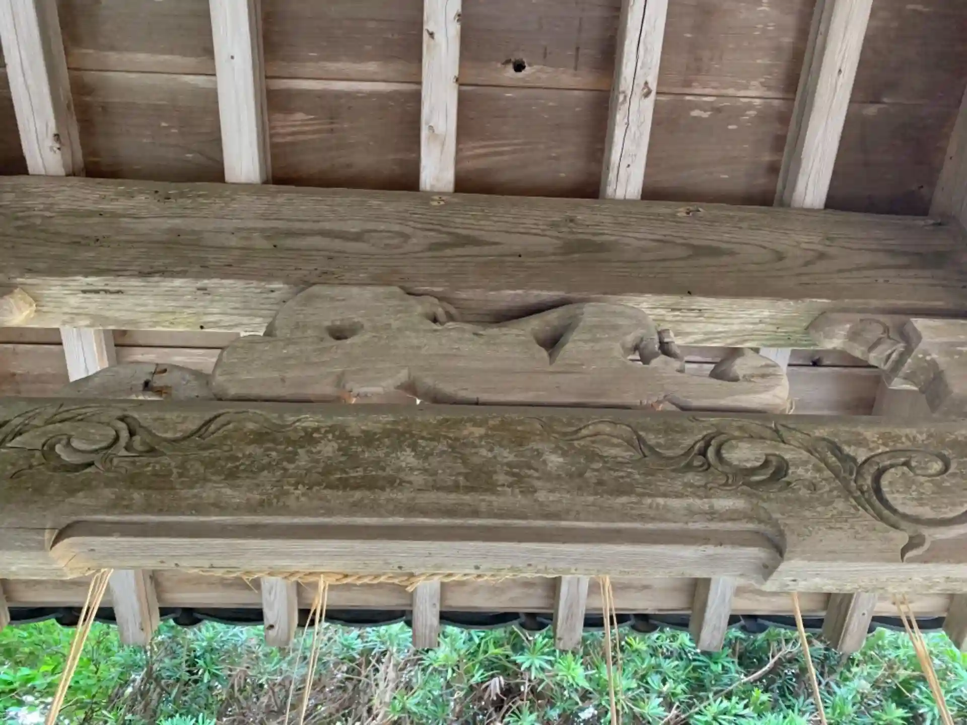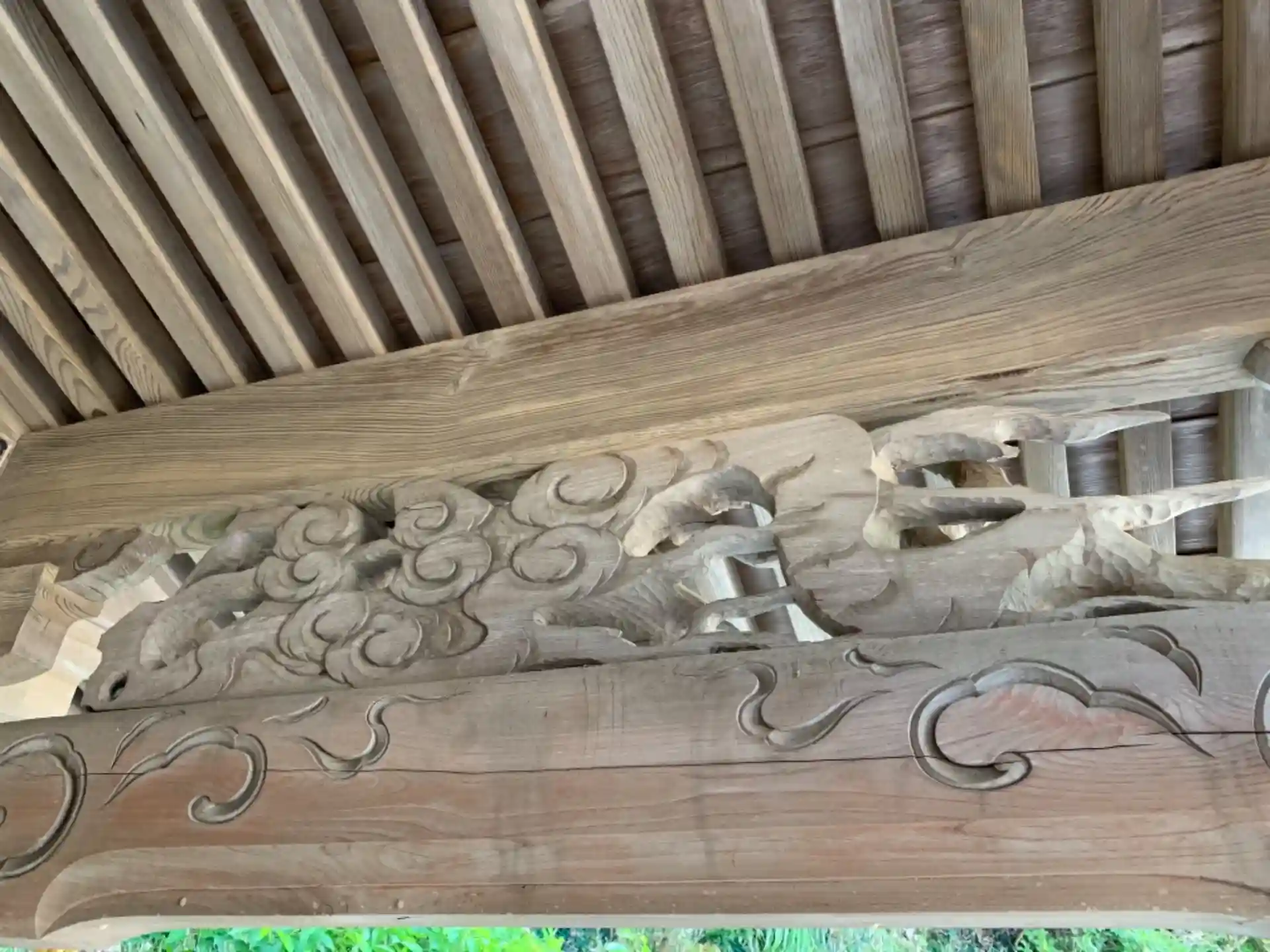 社殿だけでなく社務所にも龍がいました。どちらも作者は不明です。社務所の龍は僅かに彩色が残っており、波の伊八をリスペクトした気配を感じます。