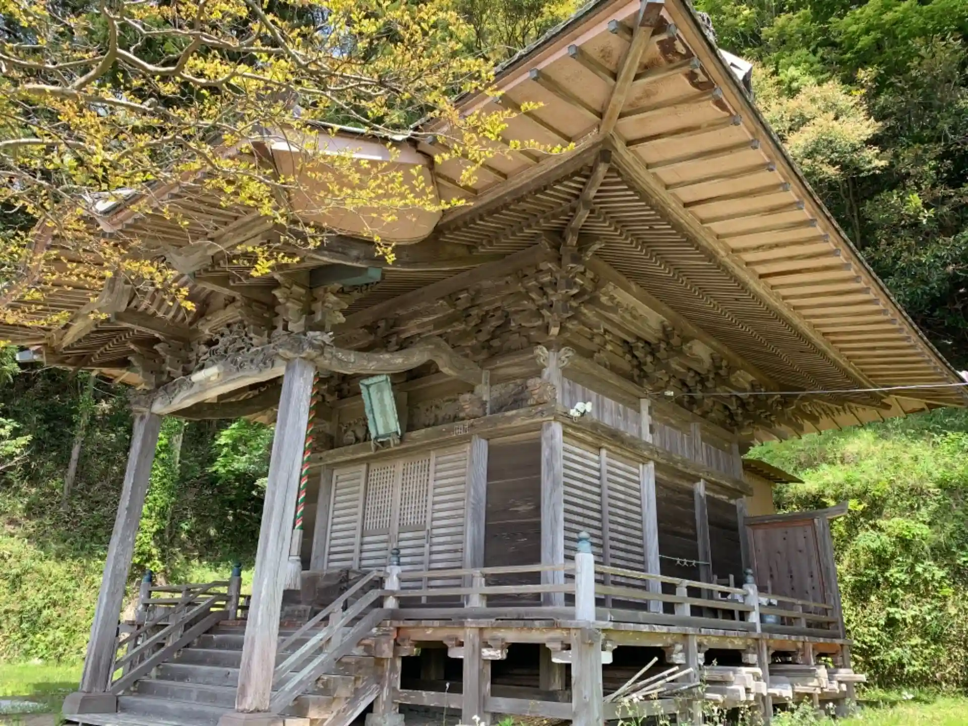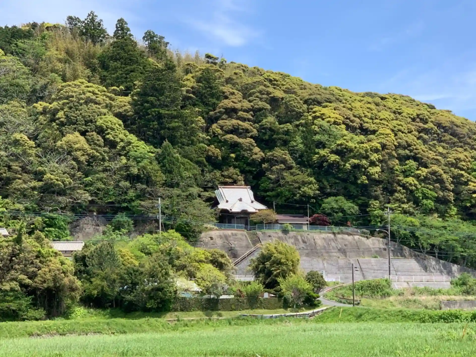 高台の上にある重厚な屋根の神社。