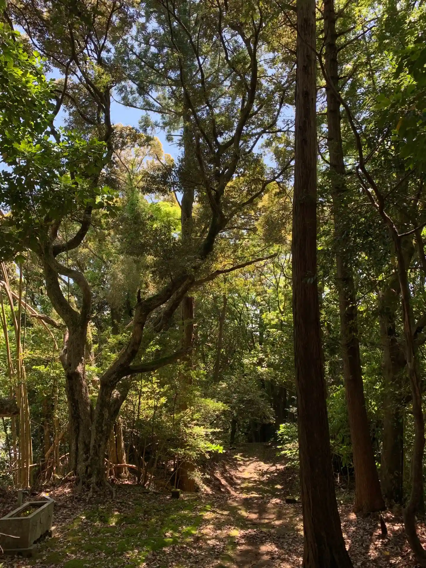 郷社。田んぼに浮かぶこんもりした山が鎮守の森です。参道や境内は生命力あふれる大きな木々に囲まれています。