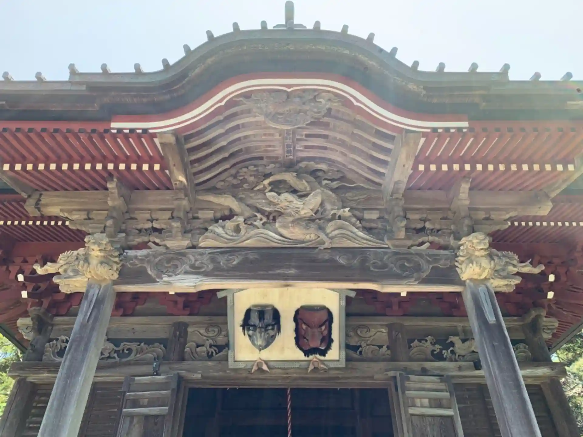 歴史を感じさせる茅葺の山門には、よく見ると波乗り天狗がたくさんいます。梁のΩみたいなパーツ(蟇股)に収まっています。