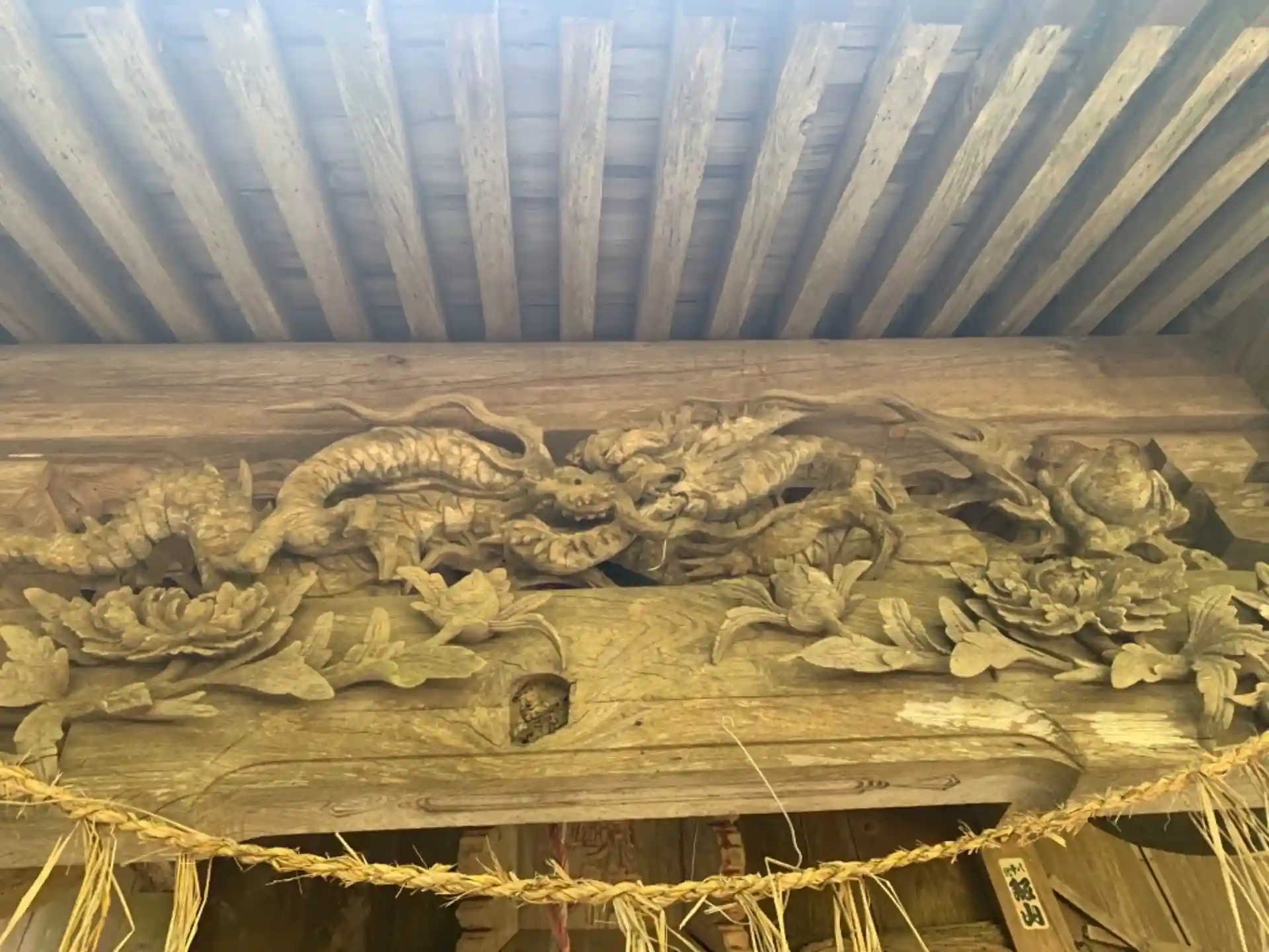彫刻は長谷川寅五郎の作品。獏の代わりに波と魚が籠彫で表現されており、卓越した技術を有していたことがわかります。
