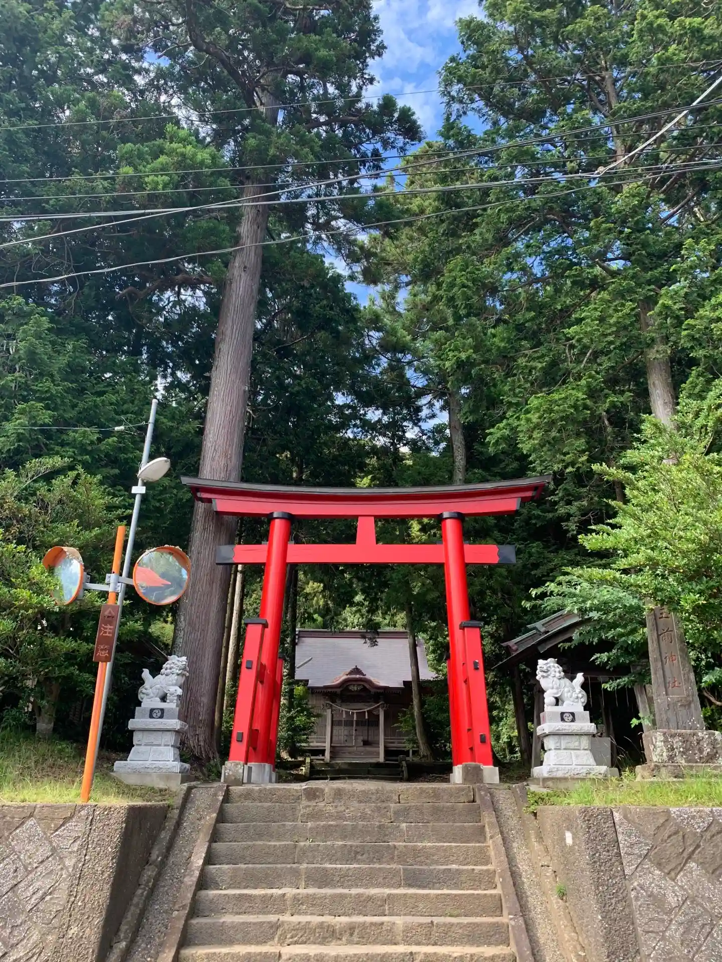 住宅地の片隅にひっそり建つ神社。参道が道路で切れていて、道路の両脇に鳥居があります。