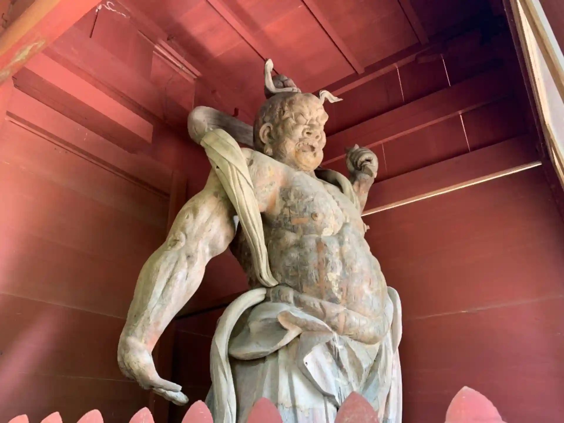 金剛力士像は筋骨隆々で、巨大なカヤの木に寄り添うように建つ古びた薬師寺とともに長い歴史を感じさせます。