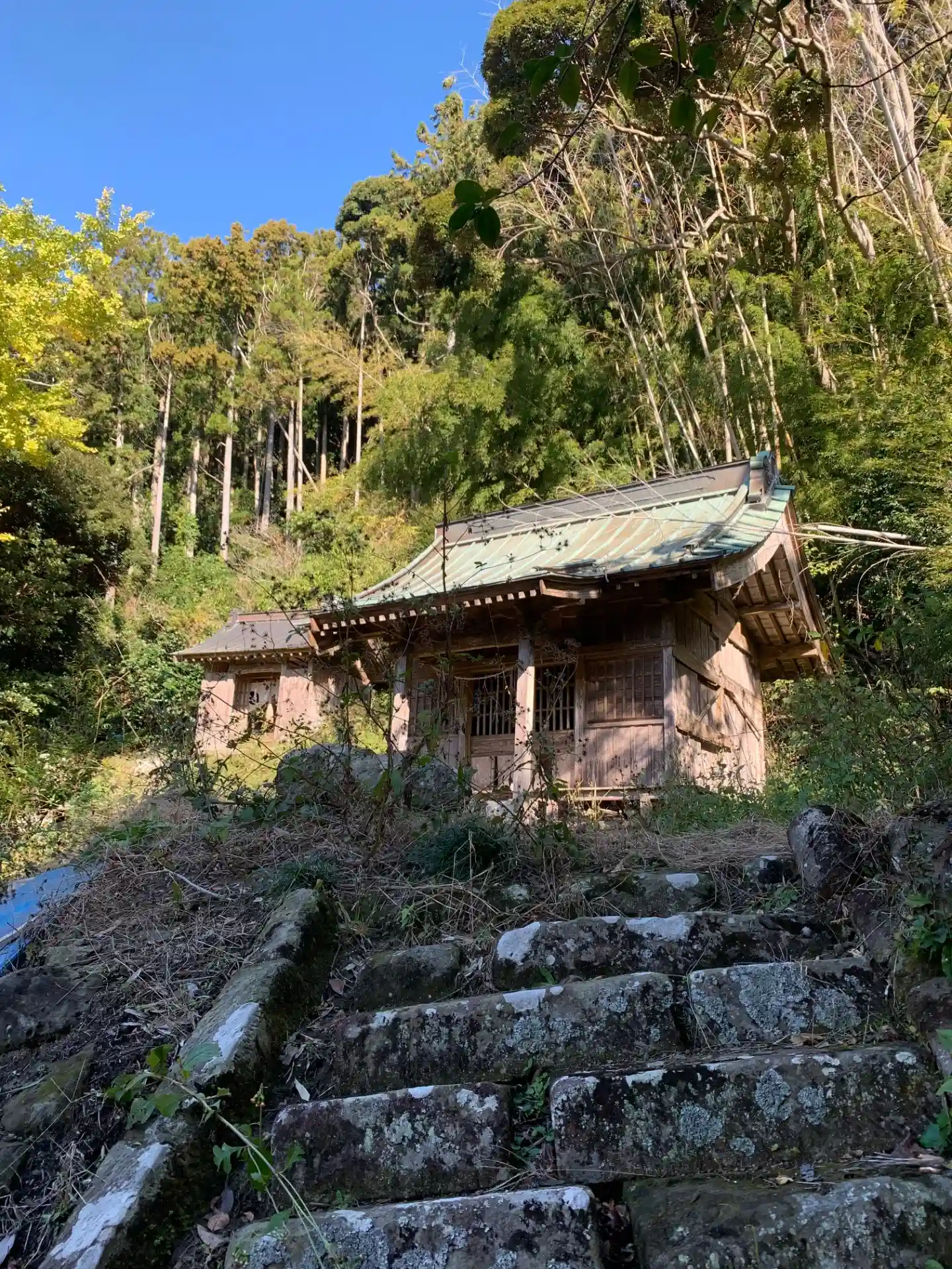 山あいに民家が数件あるだけのすごい立地にある神社。社殿が二つあり、やや摩耗しているもののすごい狛犬…