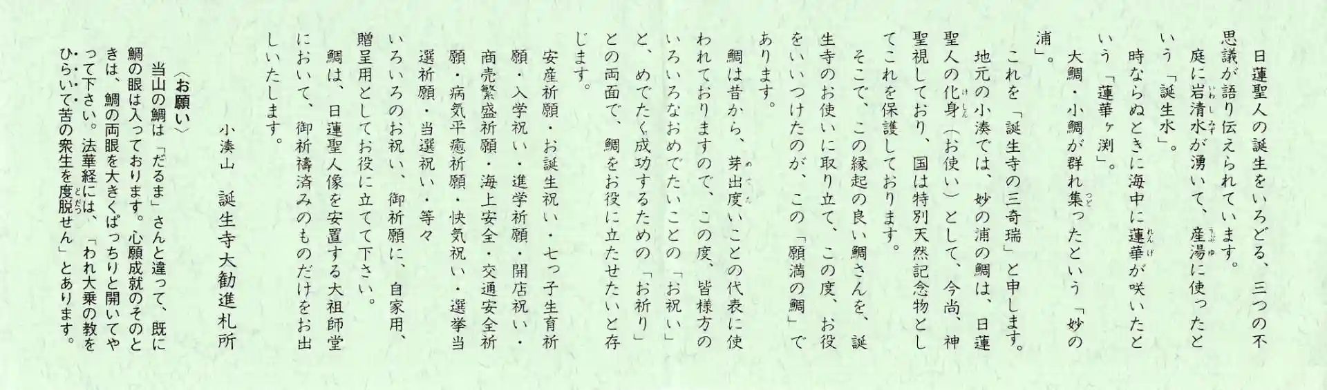 そこで、この縁起の良い鯛さんを、誕生寺のお使いに取り立て、この度、お役をいいつけたのが、この「願満の鯛」であります。