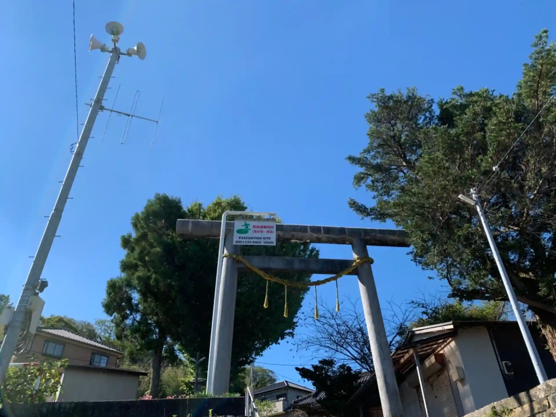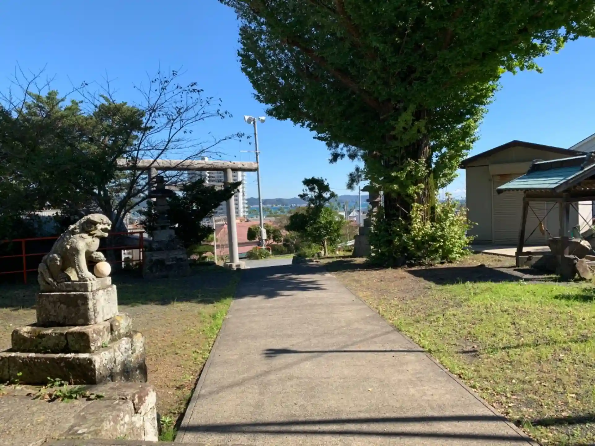 丘の上にある鳥居が大きな神社。狛犬が玉の代わりにブイを持っていました。