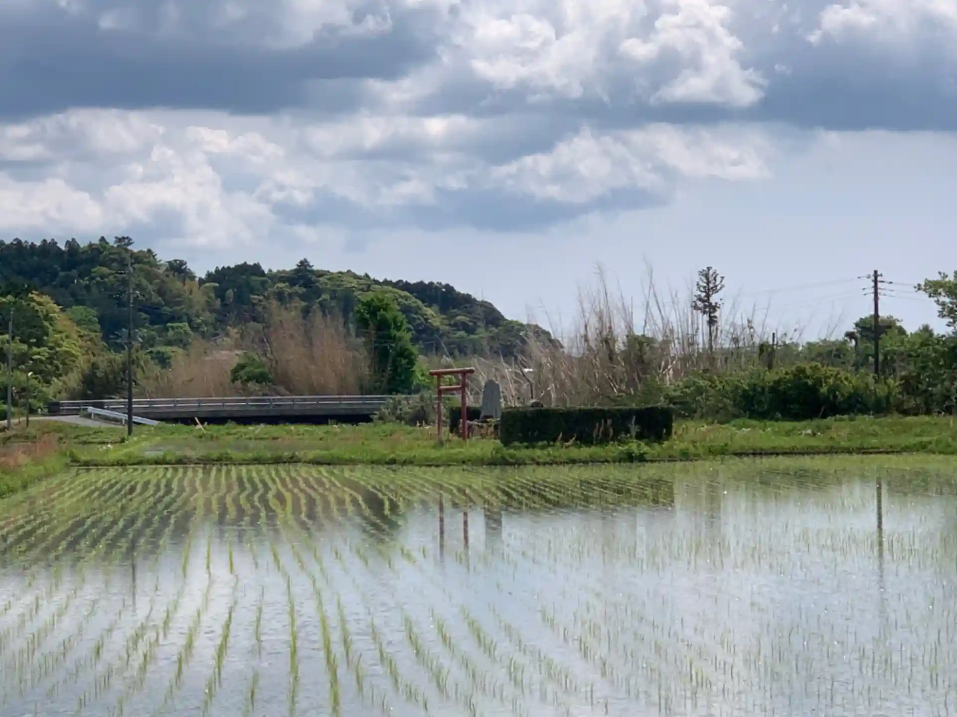 田んぼの中に小島のように浮かぶ鳥居と祠。川側から入ることができます。