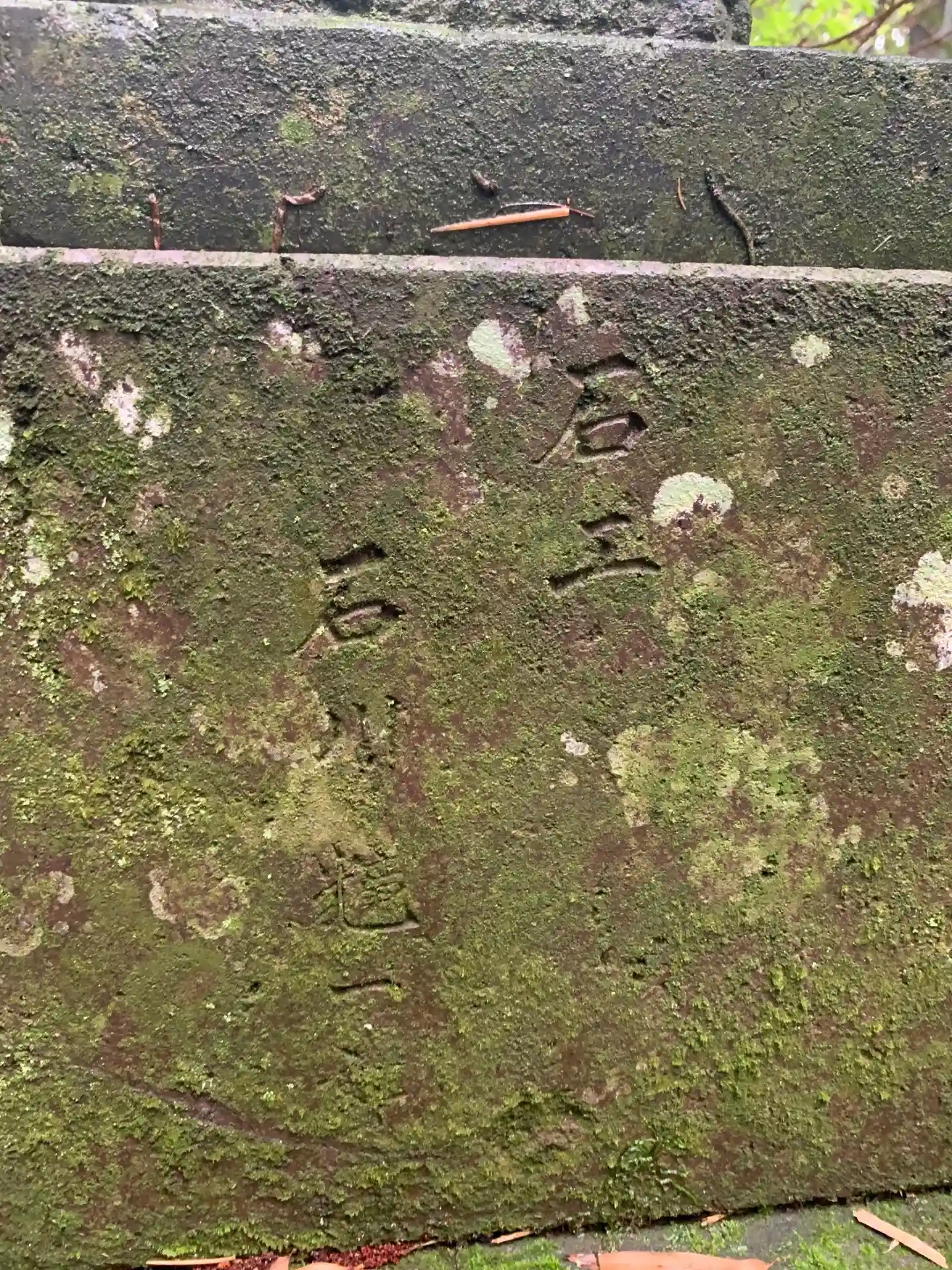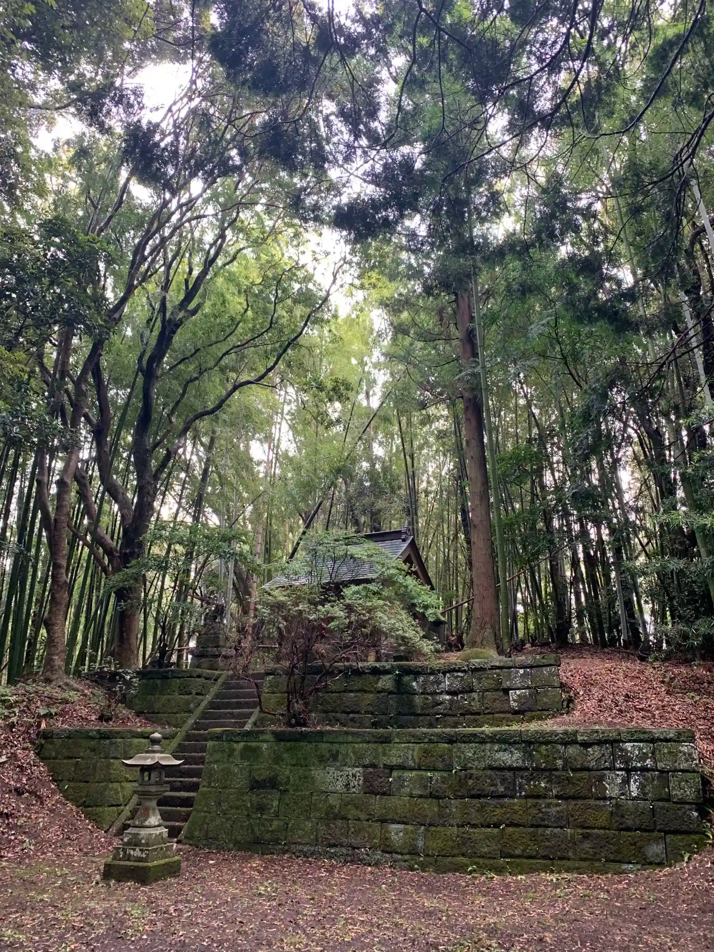 暗くて長い石段を登ると竹林に囲まれた小さな祠が現れます。石垣の上で睨みを効かせる狛犬は一見の価値あり。作者は石川光一。