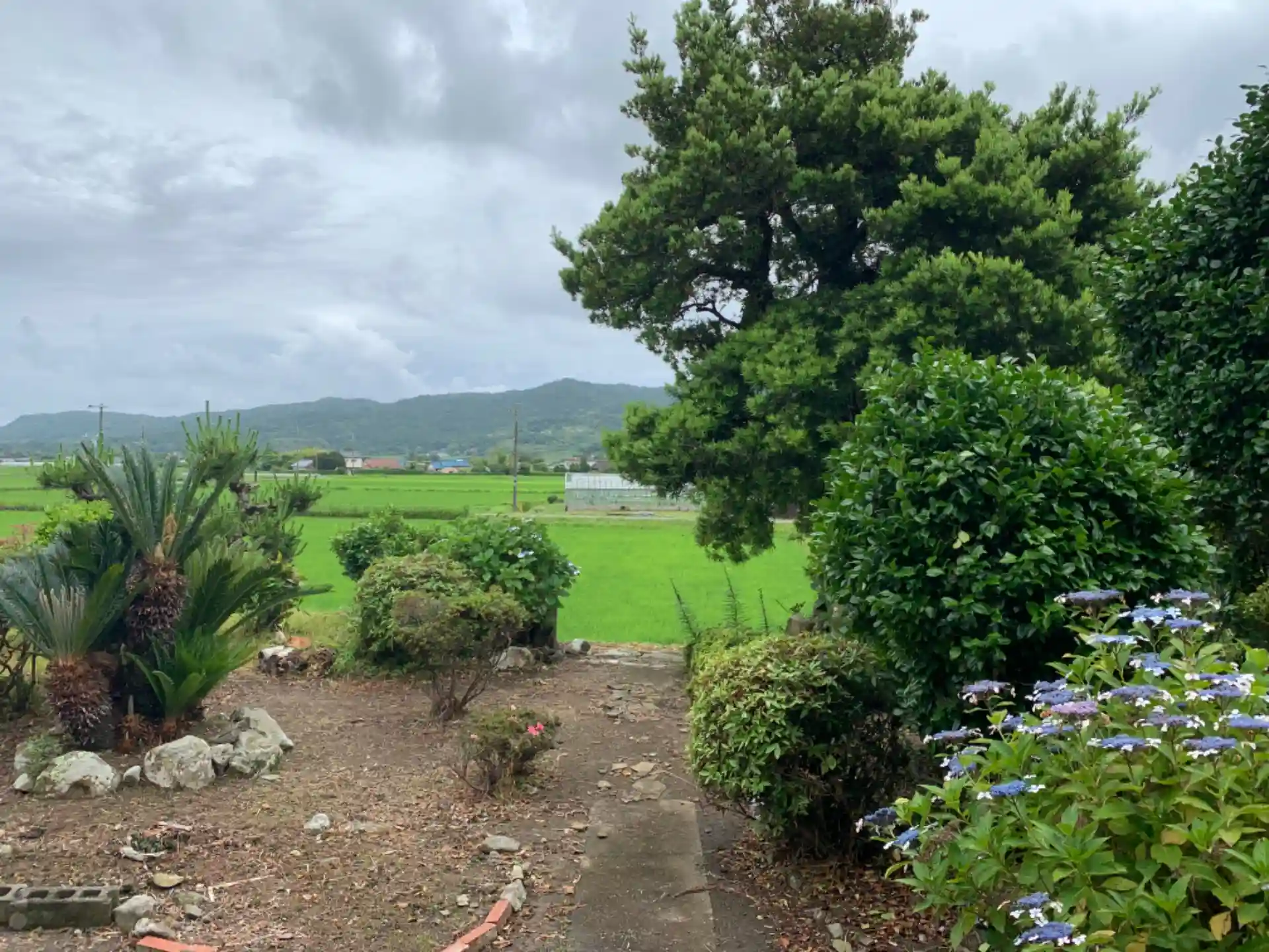 古びたお寺。シュロと紫陽花で境内を飾っていました。