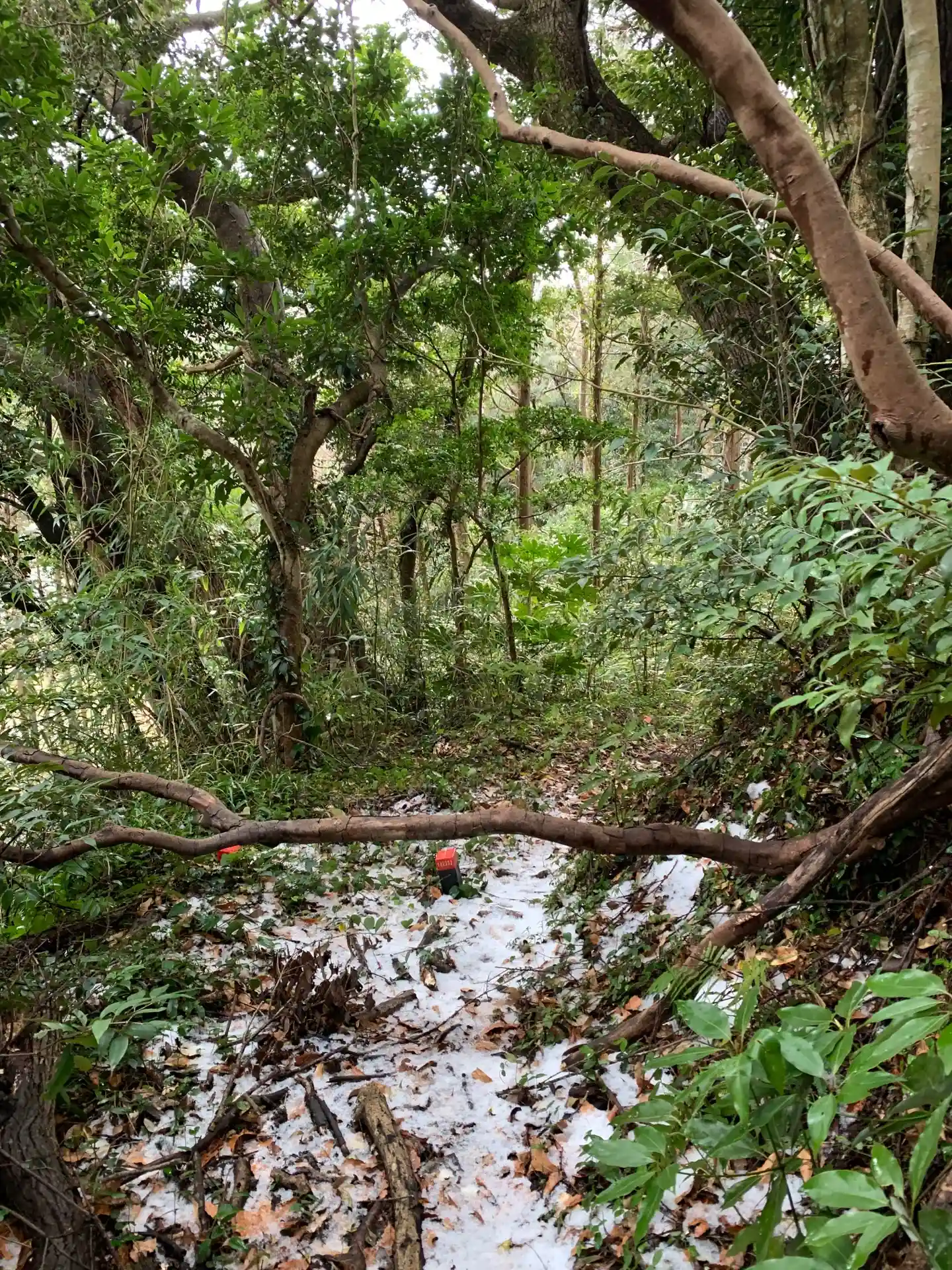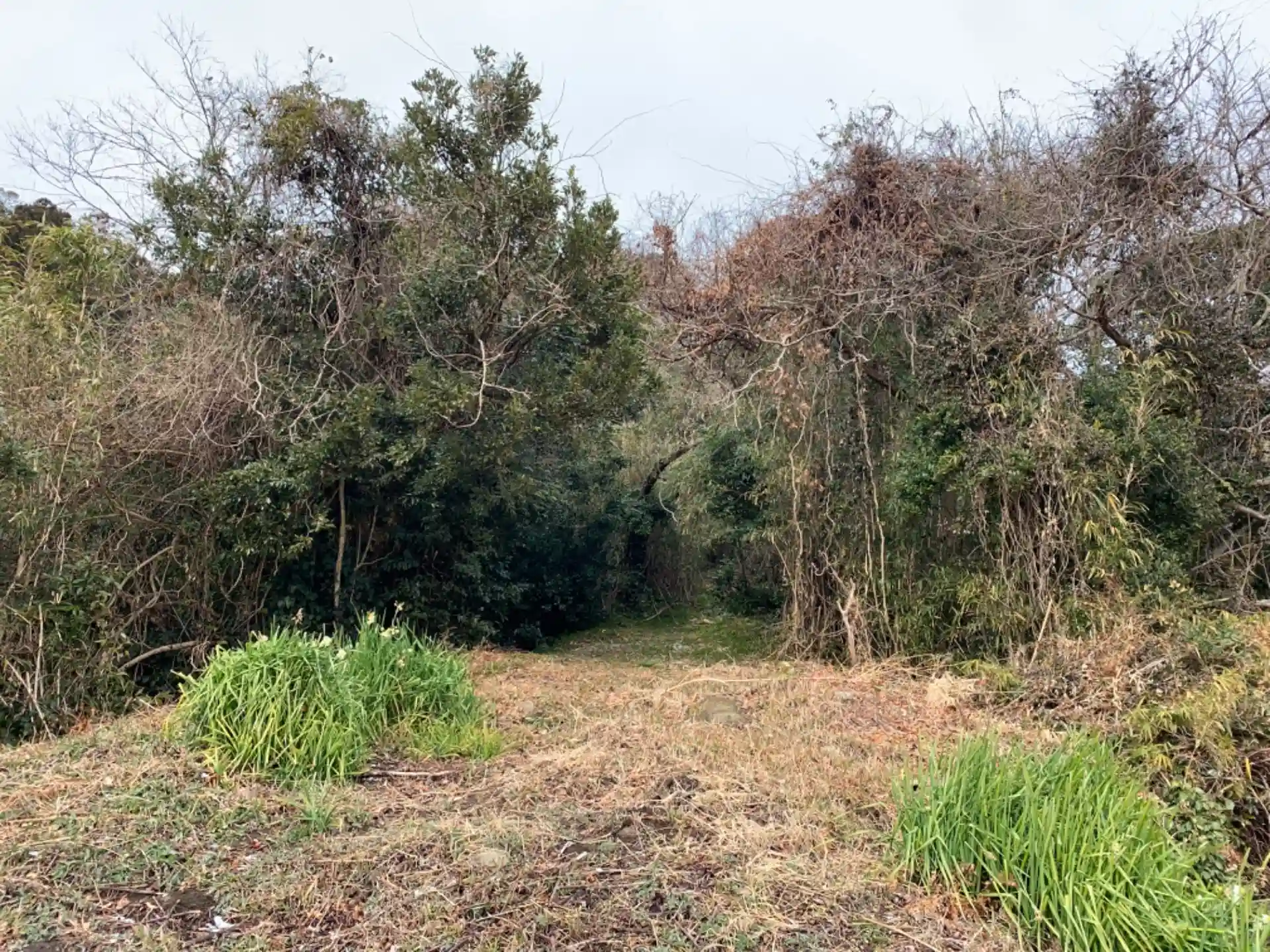 再チャレンジ。どうしても道がわからないので北側から崖をよじ登って竹藪や倒木をゴリ押しで突き進んだ結果泥だらけになりました。正規ルートは南側にあります。シュロ畑を横目に森に入る道があります。