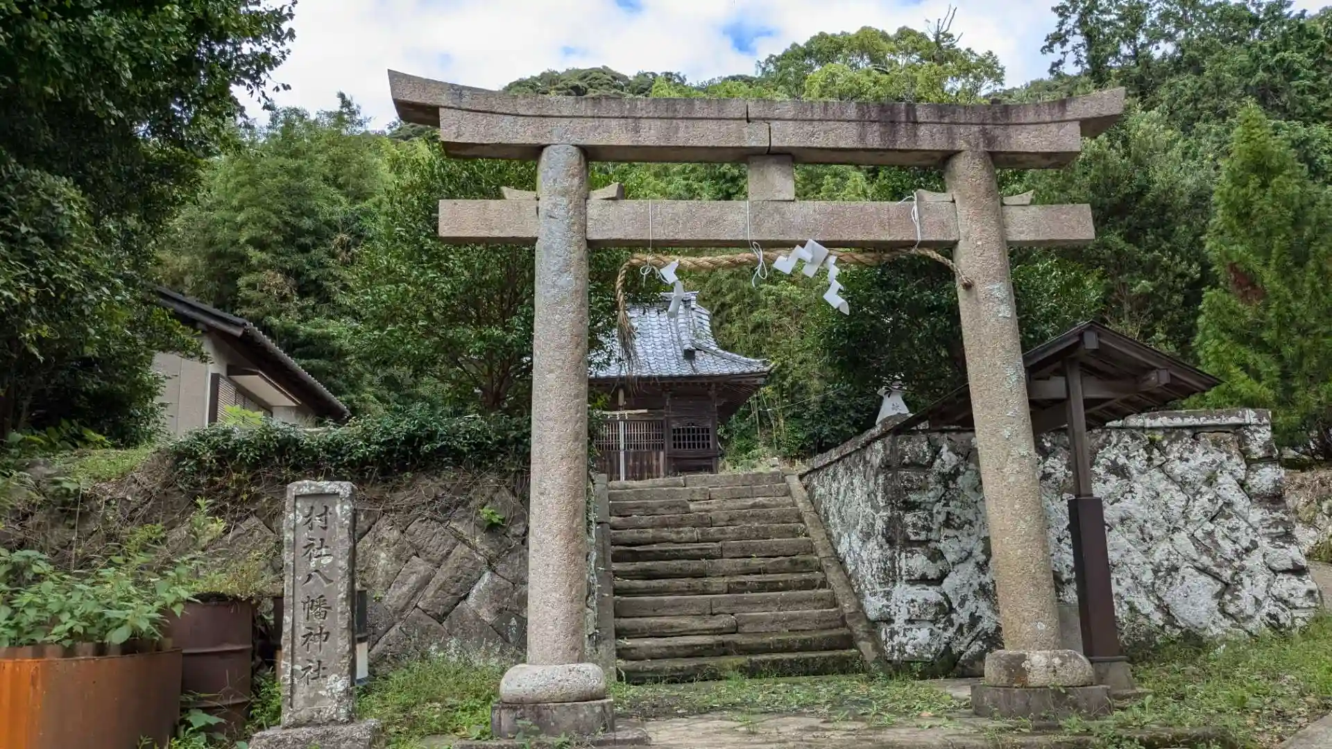 無人ですが村社ということもあり鳥居や社殿は立派。隣には普門院さんがあり後ろには富山の森が広がっています。