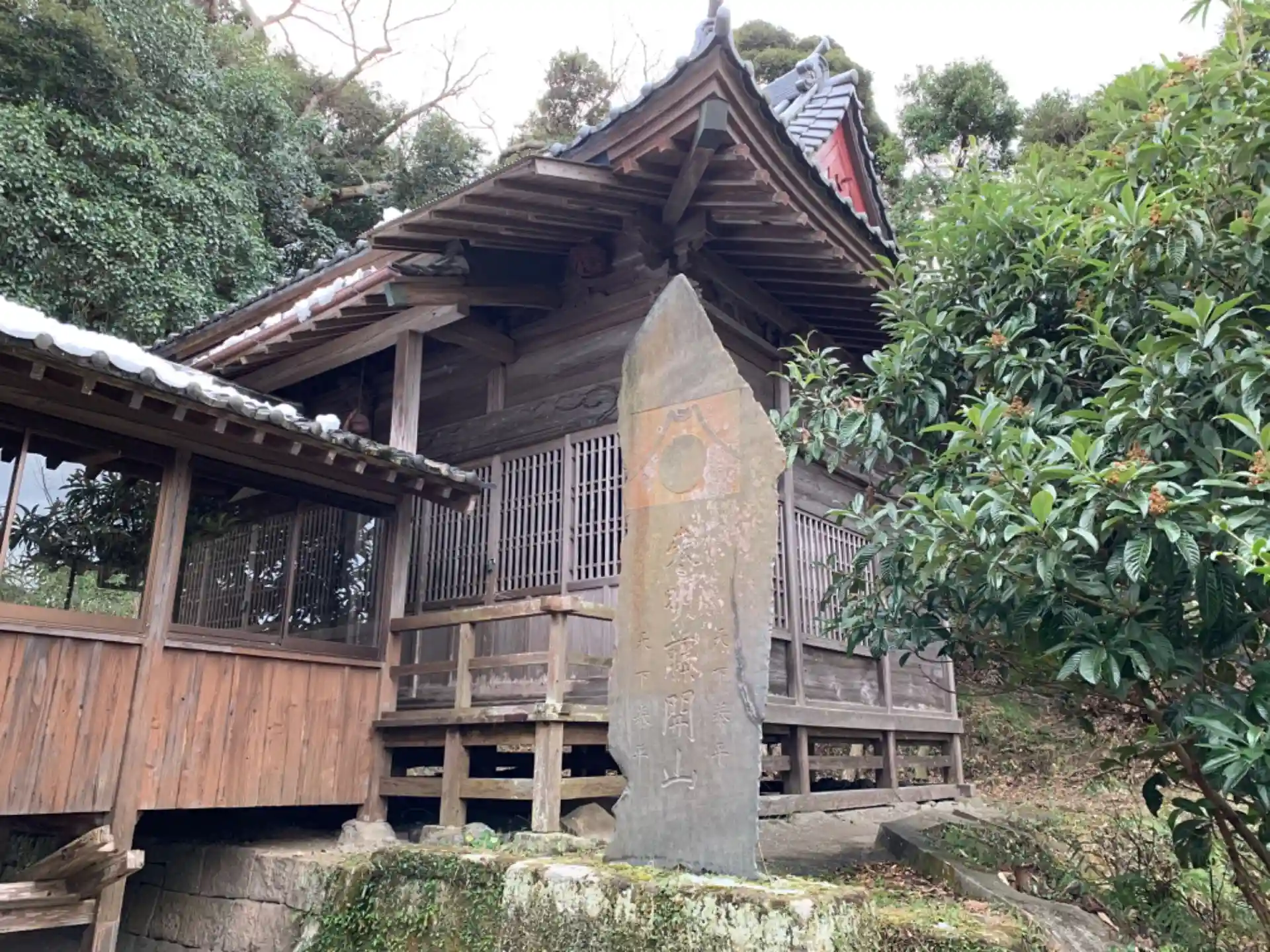 田んぼの蛇行した道の先に鳥居があり、古びた石段を登ると立派な社殿があります。