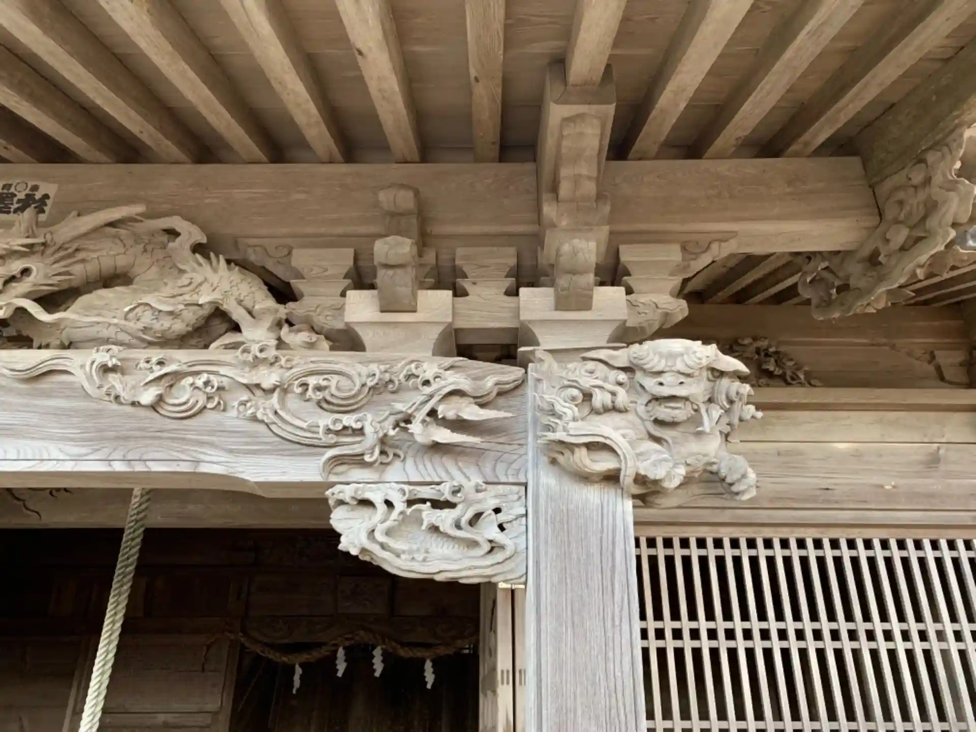 拝殿の中を覗くと亀に乗って竜宮城を目指す浦島太郎がいます。珍しい題材ではありますが、さすがは海辺の神社です。浦島太郎には銘が彫ってあるので、ひょっとしたら義光とは別の誰かかもしれません。