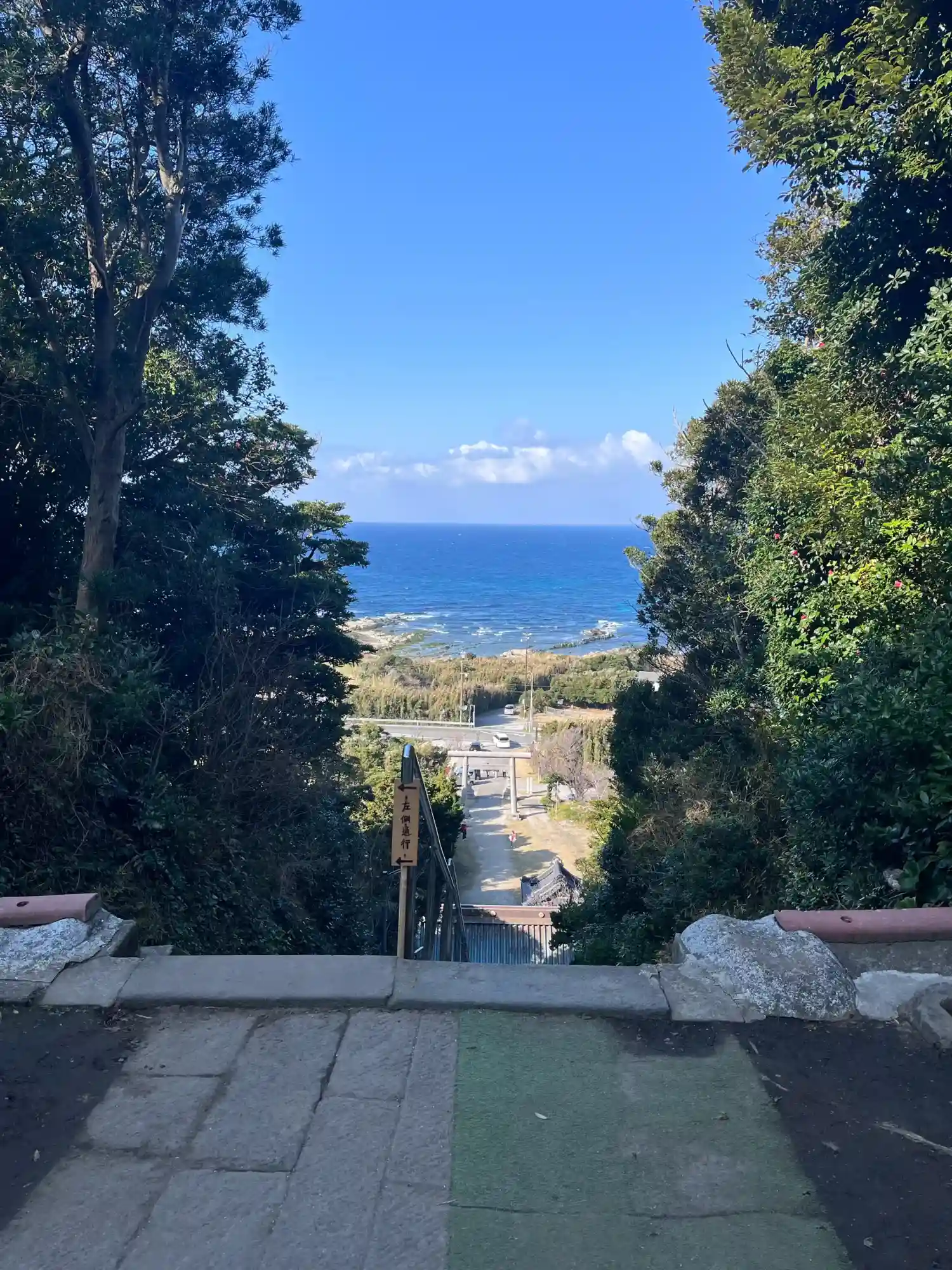 急勾配の長い階段を登りきり振り返ると太平洋が遠くまだ見渡すことができ、房総半島の先にあるので富士山も見えるという、一粒で二度美味しい絶景スポットです。