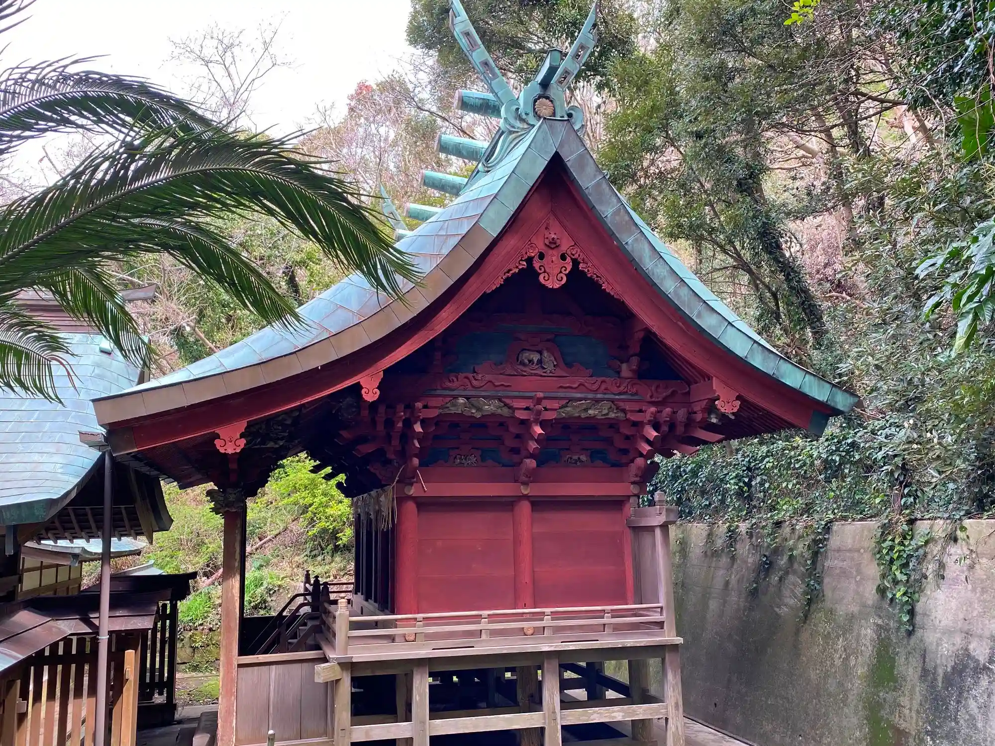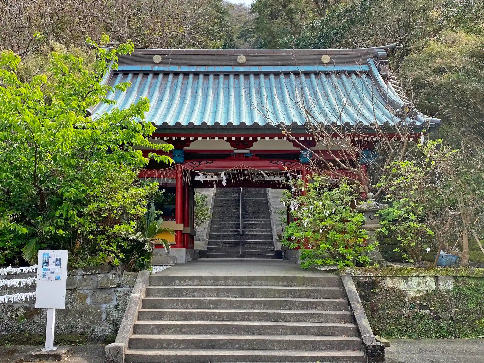 当社は、JR内房線・館山駅の南西12kmにあって、公共交通機関だとバス25分、徒歩10分。車だと富津館山道路・富浦ICから南西に道のり18km。房総半島南端の東京湾に突き出した部分にあって、一之鳥居は海のそば、社殿は海が見渡せる小山の上にある。境内は狭く、社殿も小さくて、現在の雰囲気は<村の鎮守>クラス。兼務社になっていて、通常時は神職の方はいない。