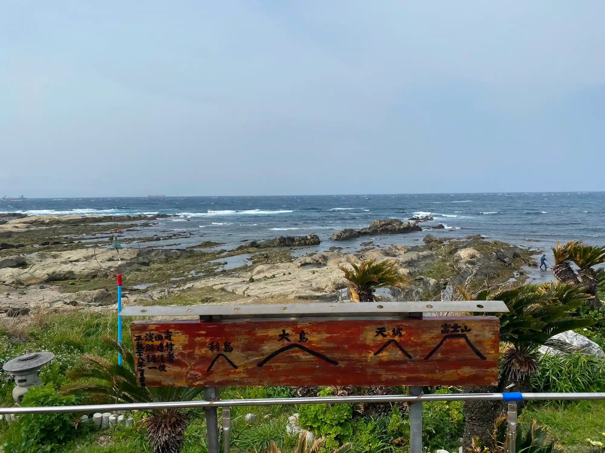 海辺は岩場になっている。展望解説図によると、右から富士山、天城、大島、利島が見えるらしい。