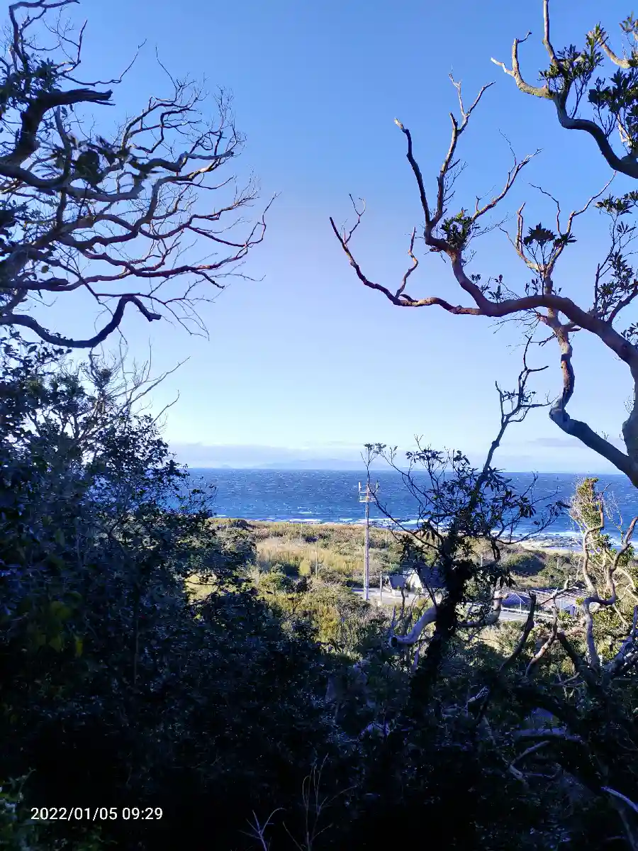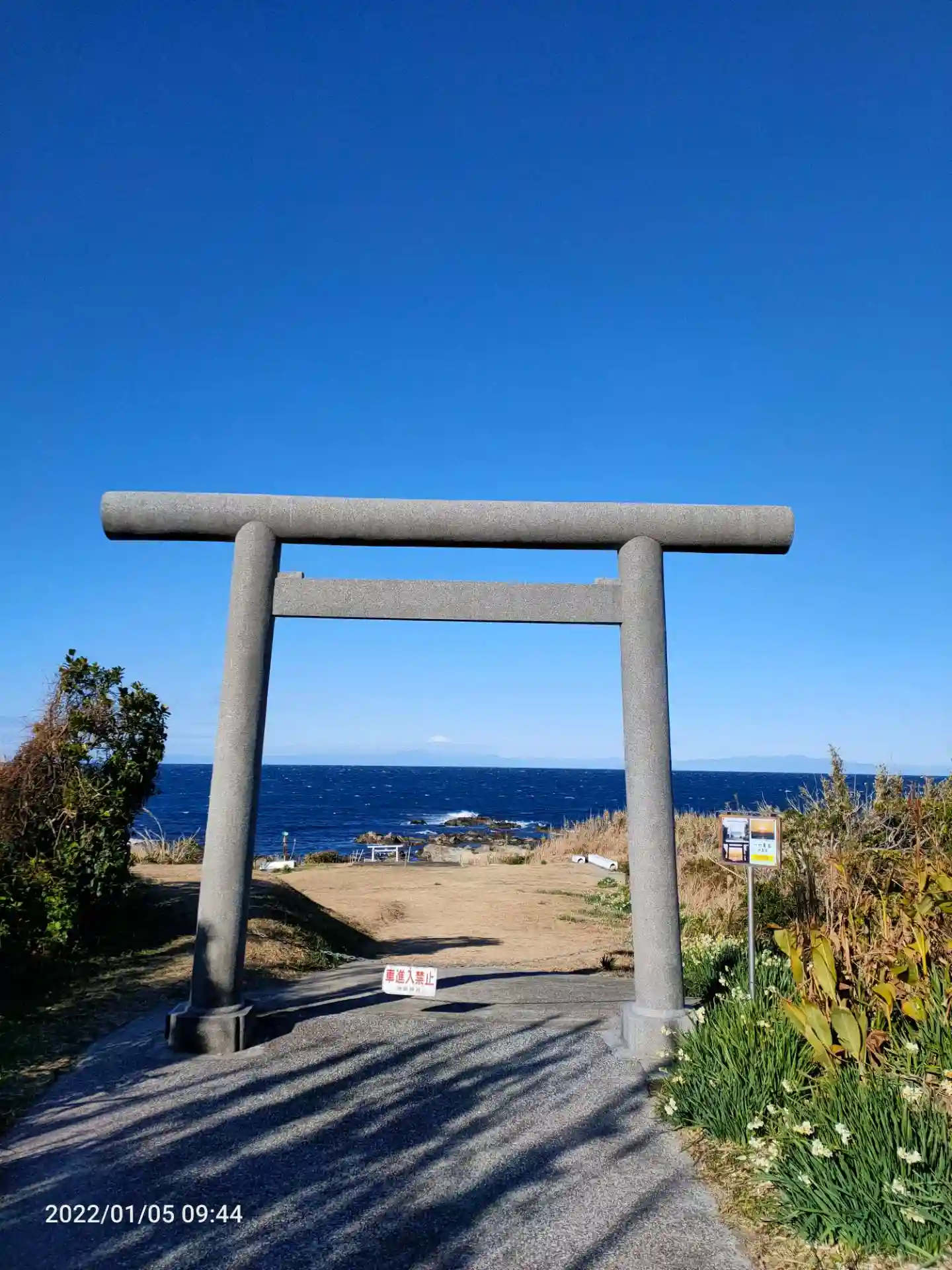 洲崎神社参拝後、一の鳥居が海辺にあることがわかりました。さっきのは一の鳥居じゃなかった… でもくぐれません。バスの時間が迫ってるのでダッシュしました。