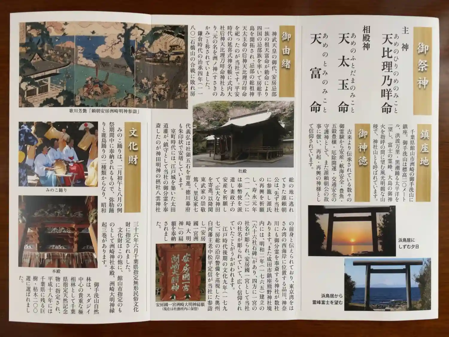 | ご由緒 | 神武天皇の御代、安房忌部一族の祖天富命が勅命により四国の忌部一族を率いて房総半島を開拓され、忌部の総祖神天太玉命の后神天比理乃咩命を祀ったのが当社とされています。平安時代の『延喜式神名帳』に式内大社后神天比理乃咩命神社とあり、元の名を洲ノ神(すさきのかみ)と称されていました。