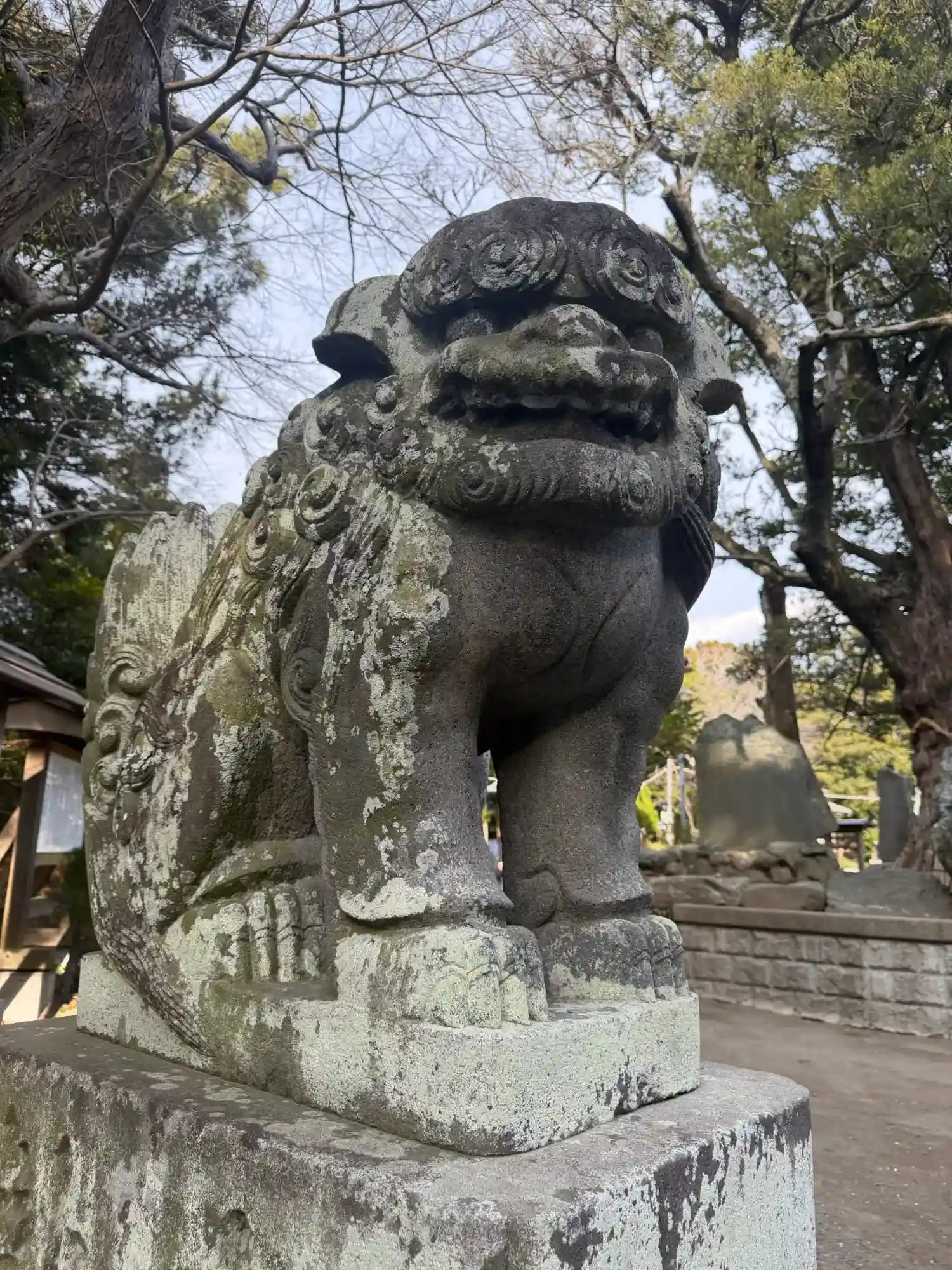 本殿や向拝(ごはい)天井で目にとまるのは、今にも動き出しそうな龍の彫刻。それは「百態の龍(ひゃくたいのりゅう)」と呼ばれる後藤義光の作品です。また、長尾藩士で書家として大成した小野鷲堂(おのがどう)・平久里の医師で幕末の詩人加藤霞石(かとうかせき)の記念碑もあります。さらに、安房先賢偉人10名の顕彰碑(けんしょうひ)、西南の役・日清・日露戦没の記念碑、文久年間の社殿再建記念歌碑、石工・鈴木伊三郎のこま犬など、たくさんの記念碑や彫刻をぜひご覧ください。