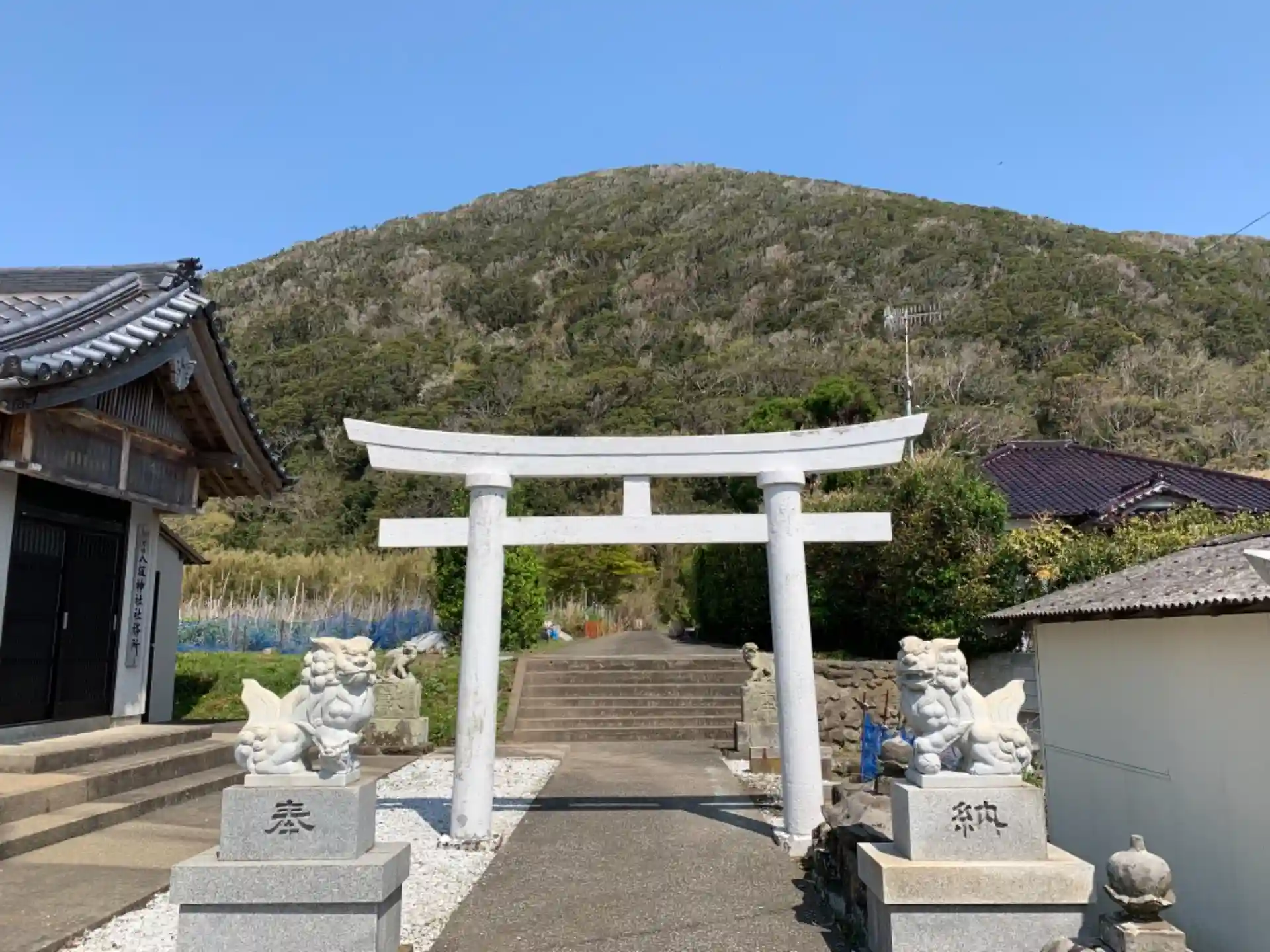 社殿は古い彫刻を生かしながら建て直されていました。狛犬も新旧世代で見守っています。石段を登って振り返ると海が見えます。