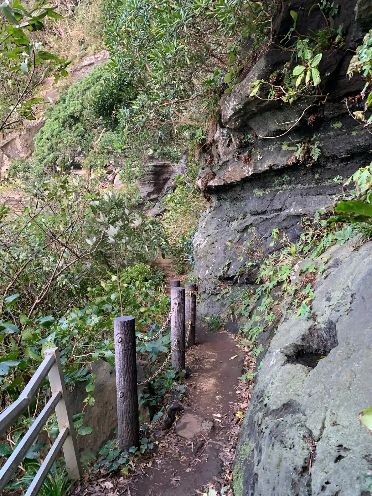 天狗が棲んでいるとか役行者に捕えられた海賊が閉じ込められていたといった伝説が残る洞窟。第二展望台の脇にある階段を降り、途中の分岐を海側じゃない方へ進んだところにあります。階段は所々崩れているため、歩きやすい靴が必須です。