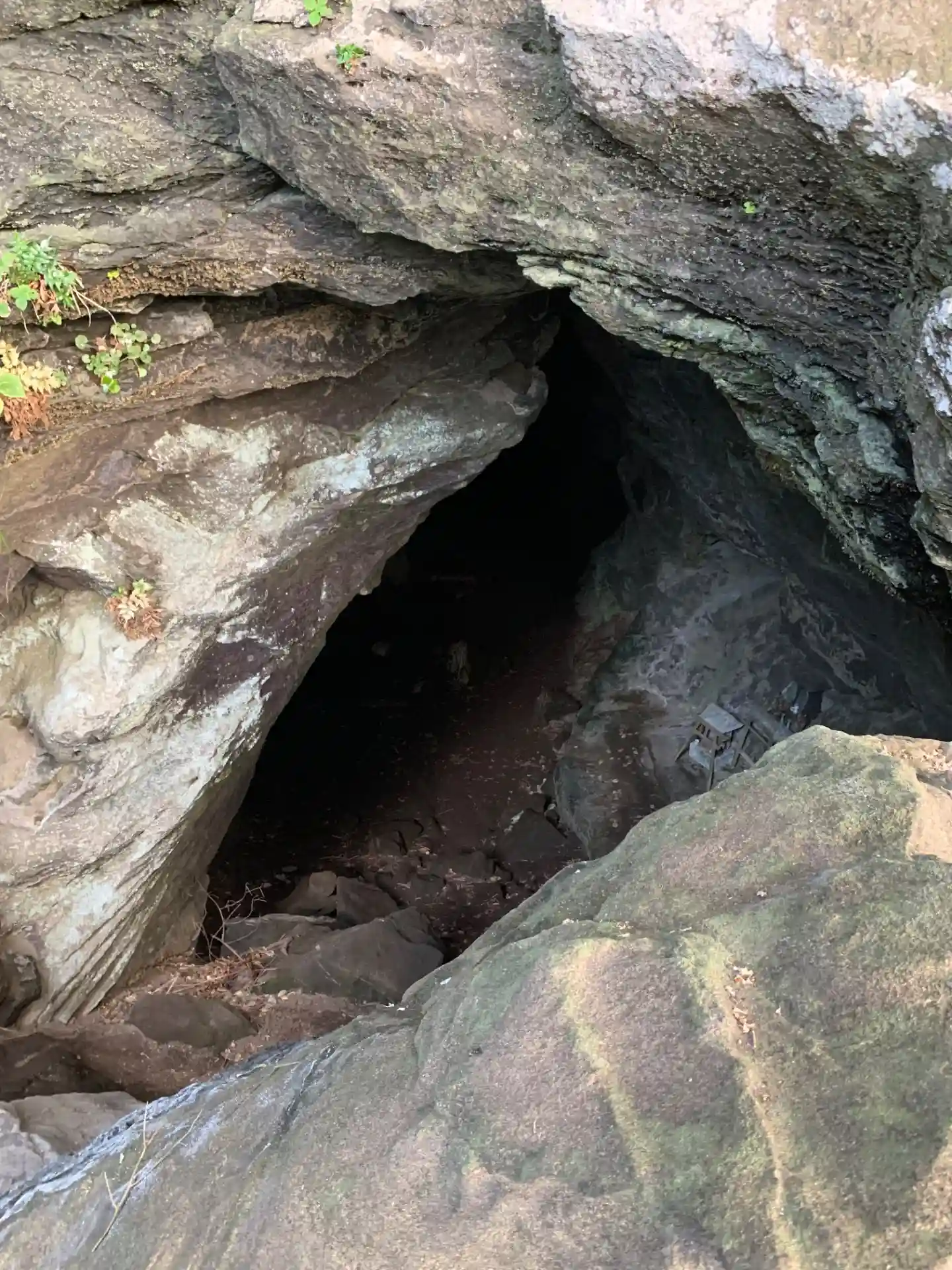 入口は派手に崩落していて、崩れた岩を伝って中へ降っていきます。すぐのところに石祠が二つあります。照明を持っていればさらに奥へ行くこともできそうでした。