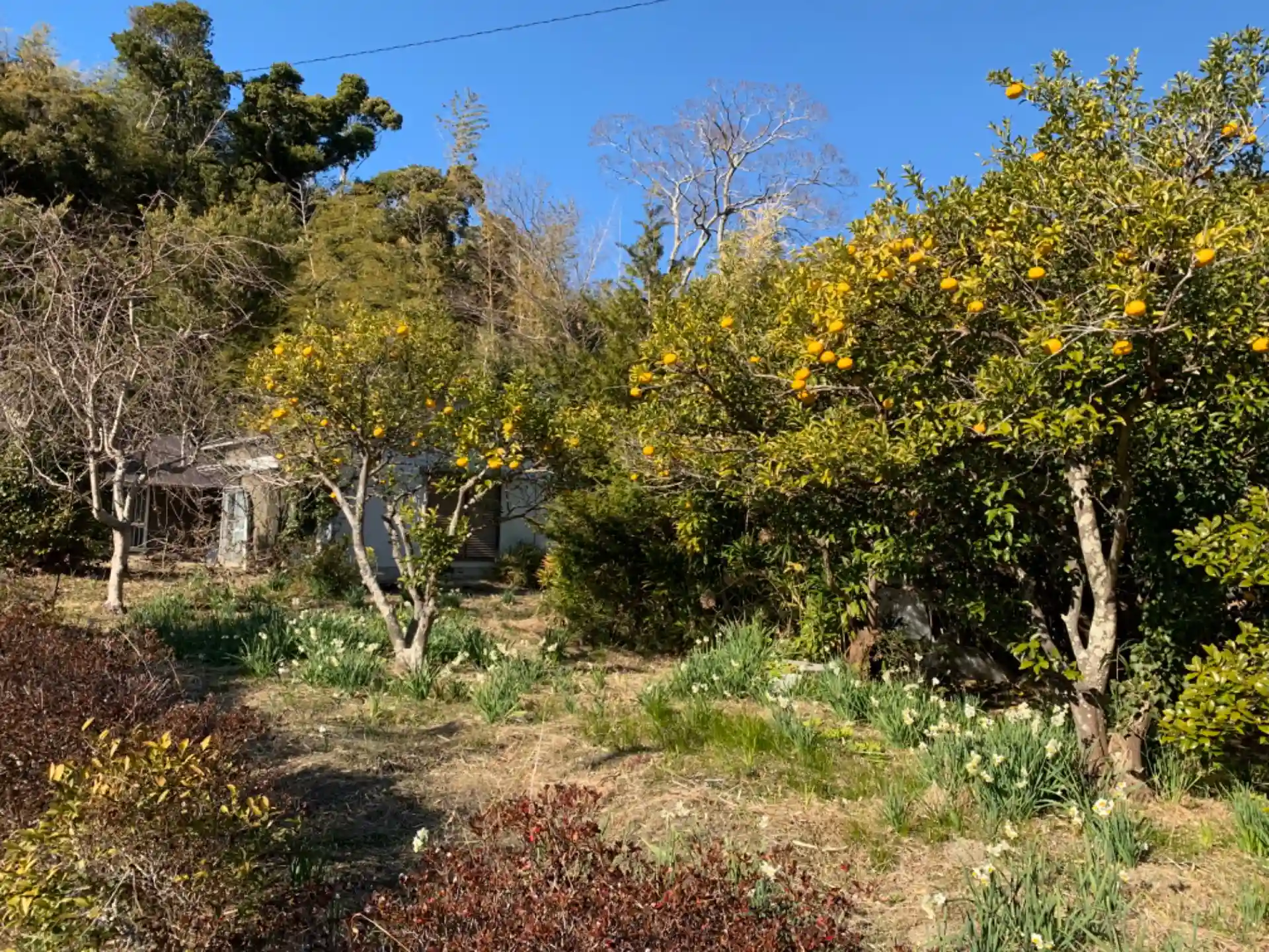 古びた石段の上にあります。境内は柑橘の実とスイセンの花で彩られていました。