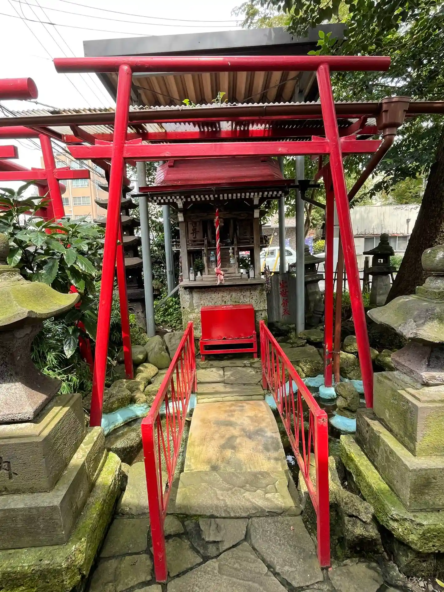 折れ曲がった参道を進み、隣の建物ギリギリに立って振り返ると社殿が見えます。
