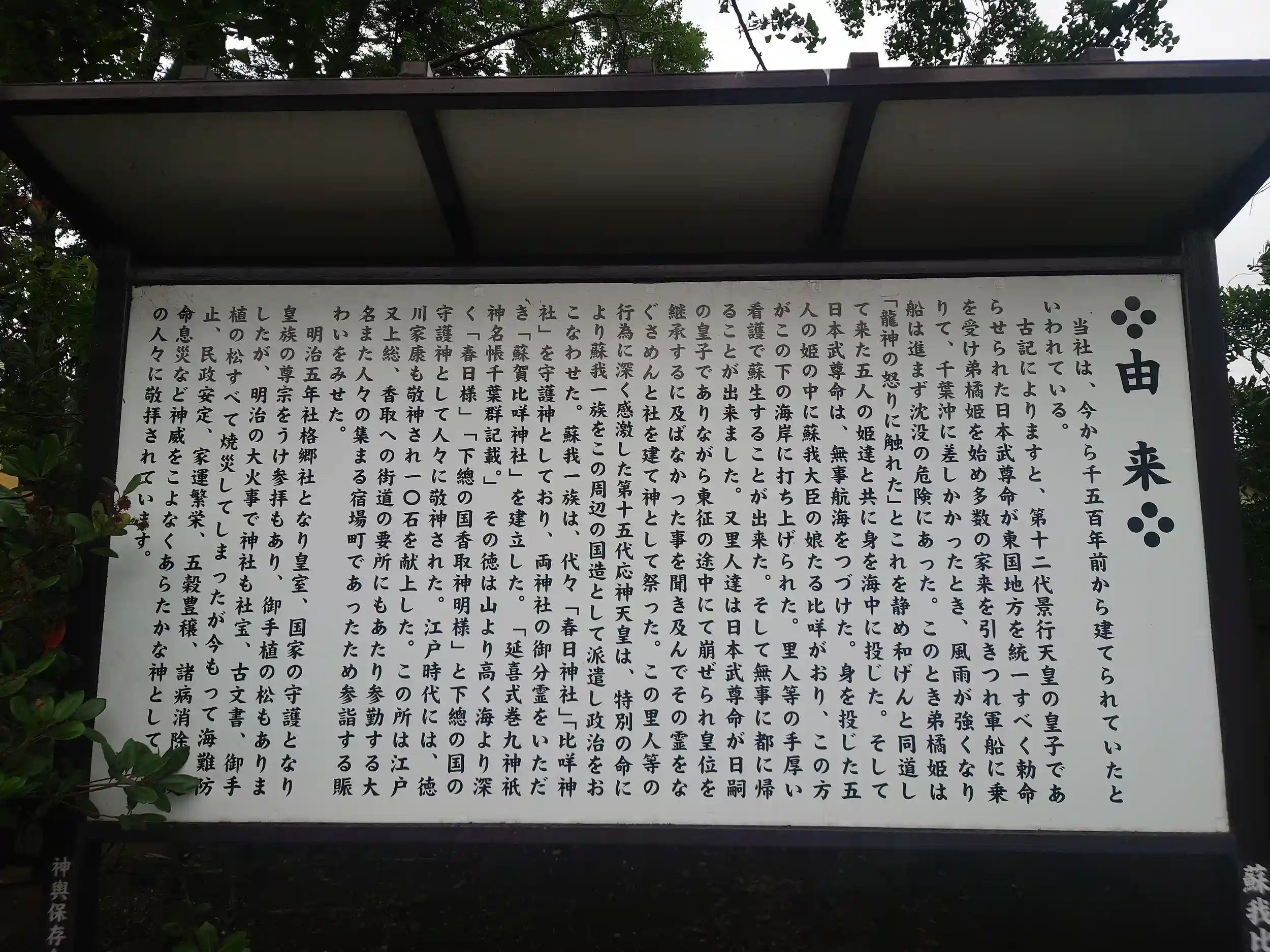 また千葉県神社名鑑には別の伝承として、里人の介抱により蘇生されたのは弟橘媛のことで、媛が『我れ蘇り』と宣り給わったことからこの地を『蘇我』と称した、とありました。