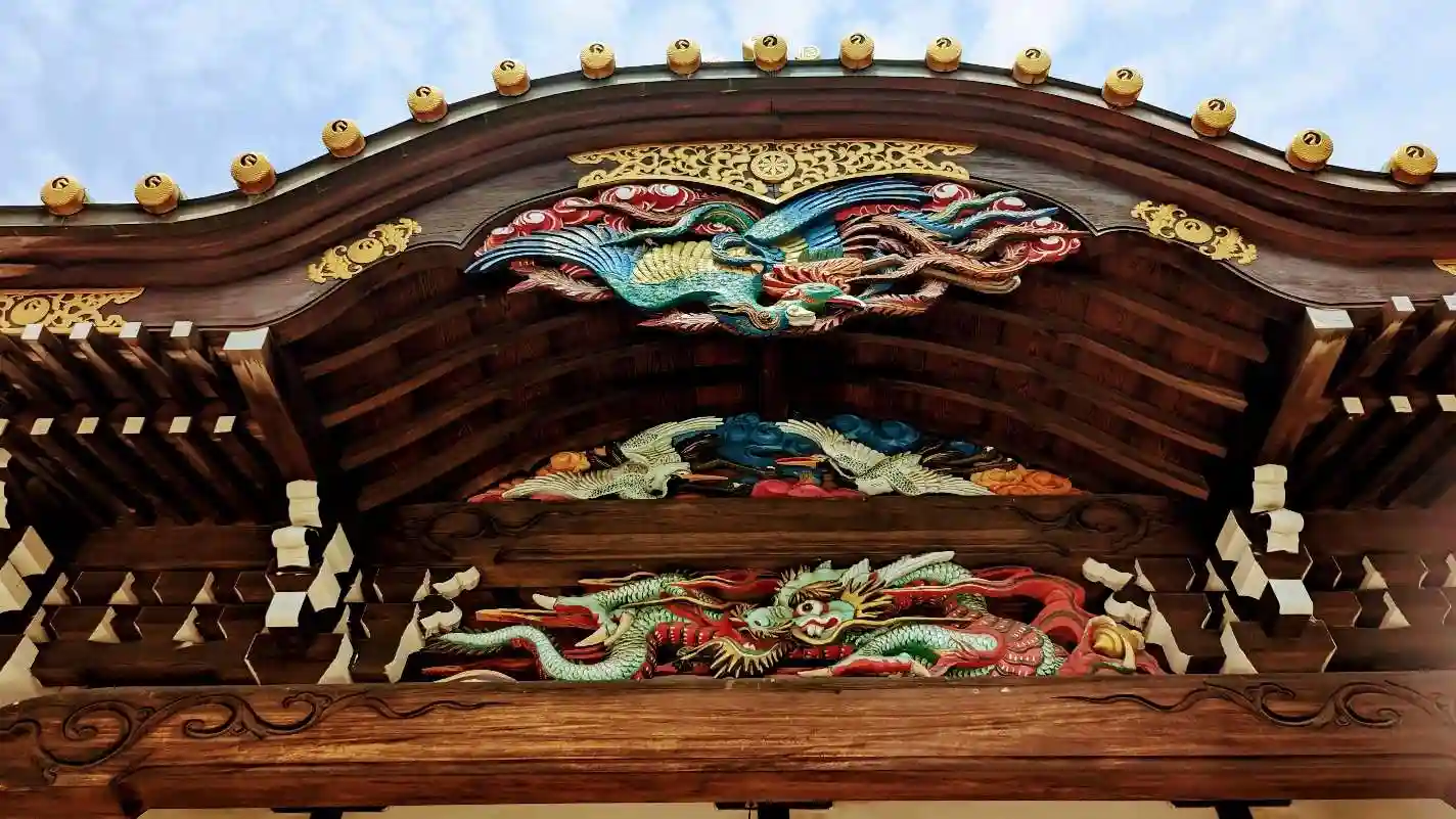 総本山大石寺御影堂と同じように鳳凰·鶴·龍の順に彫刻されています。